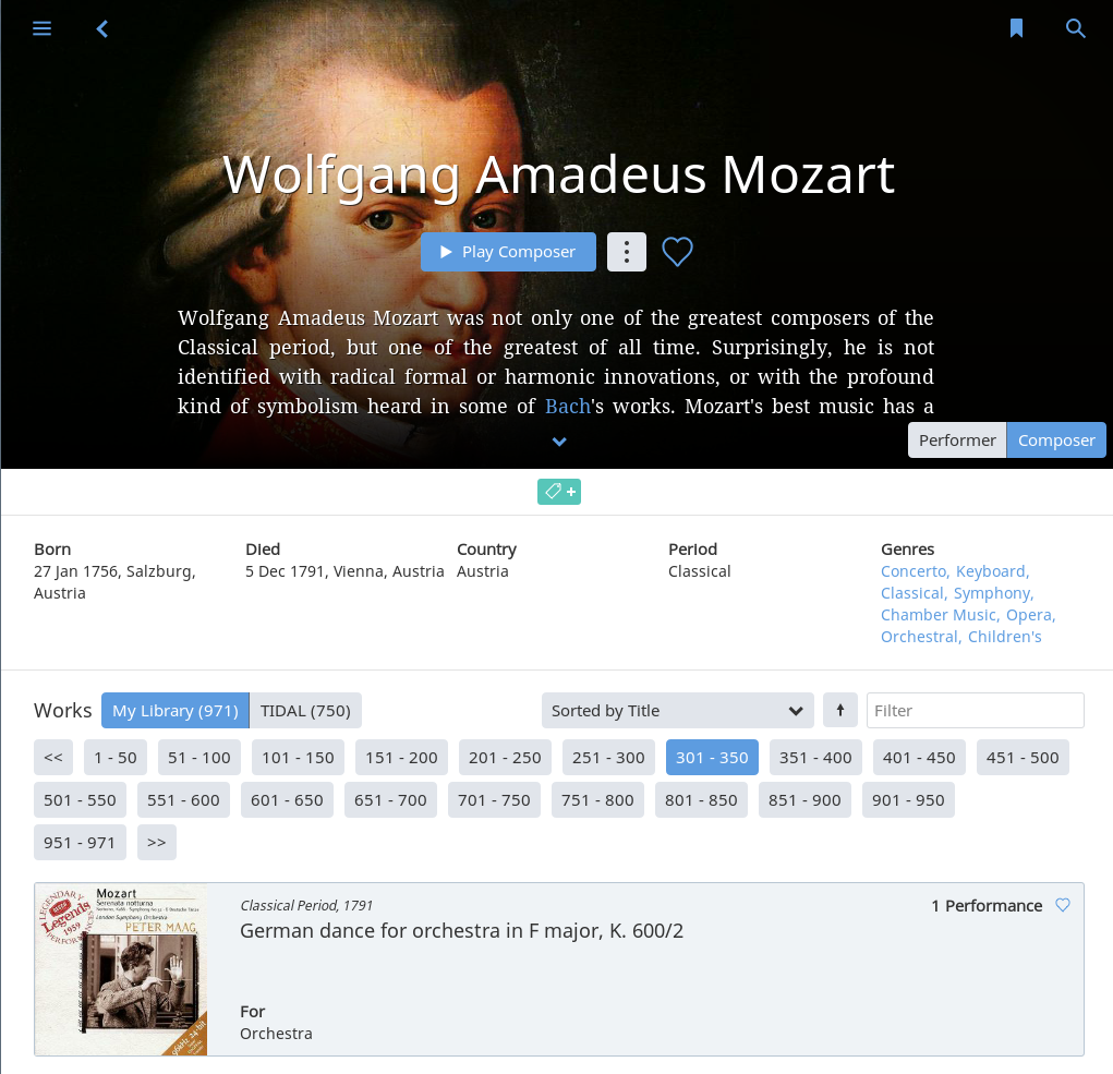 On the “homepage” of a composer, clickable genres are listed on the right. I would expect these links to act as a filter: If I click on “Concerto”, only Mozart’s concertos are displayed in the composition list below.