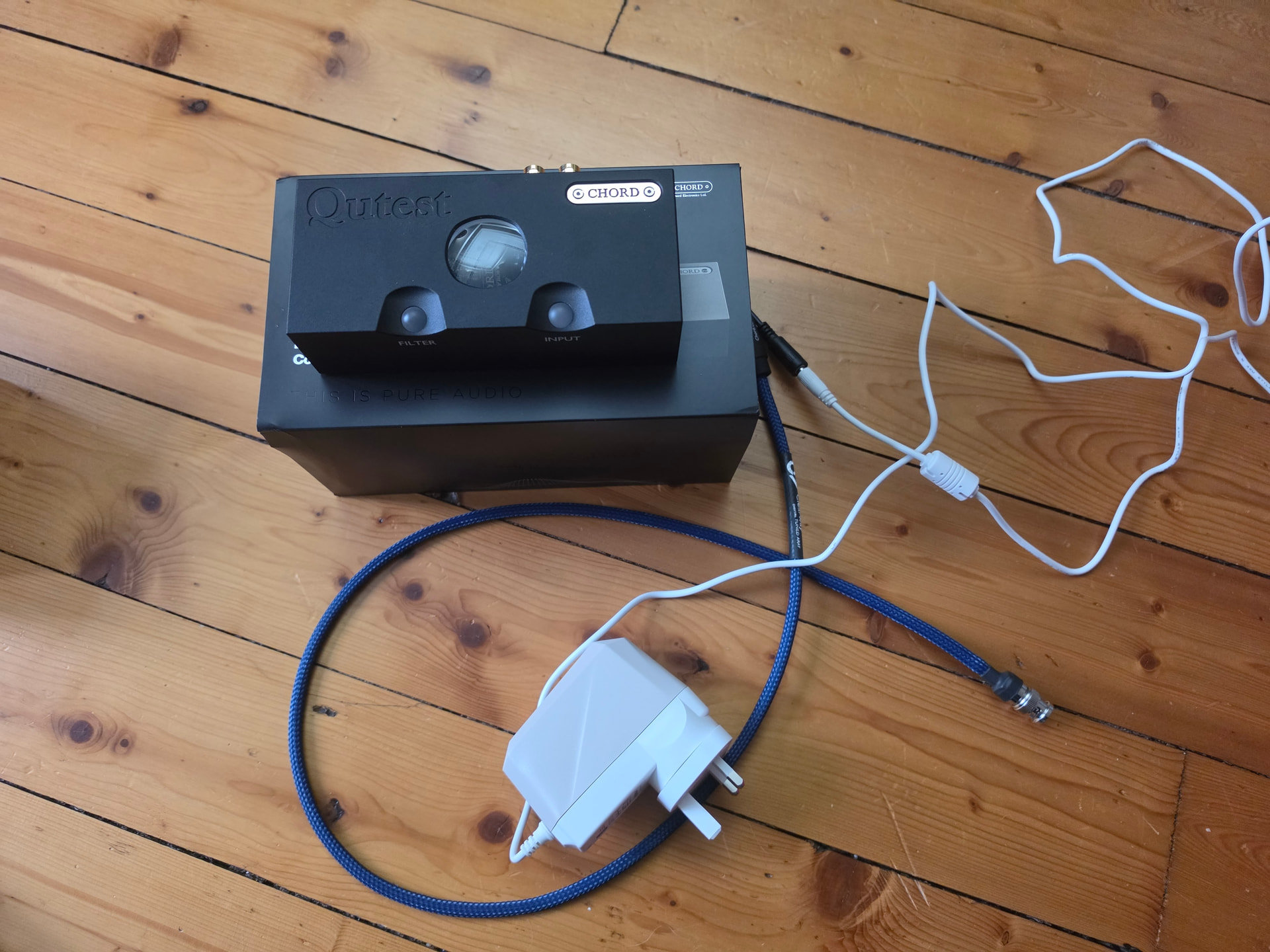 Chord Electronics Qutest DAC, and iFi Power X 5v Power Supply, + Chord Clearway RCA to BNC 1m cable. The Power supply gives a great boost compared to the stock Chord Qutest power supply. Also an RCA to BNC cable to allow Coax connection from amp to Qutest.