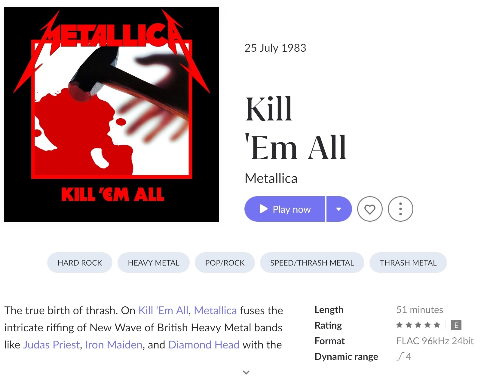 I agree that there are plenty of sub genre that are terrible hard to differentiate. Some special stuuf you need to be fan or into it for classifying it correctly. But the world famous albums…even my dad (+70) is aware of…should be at least corrected. Adding info & correct genre…maybe one move? In Wikipedia Kill Em All is NOT pop/rock…so even the source of added information is clear in that. Sounds harshly, but if you charge monthly/yearly the same for ORGANISATION of music as it cost for streaming the content…I expect a minimum of detailed quality…