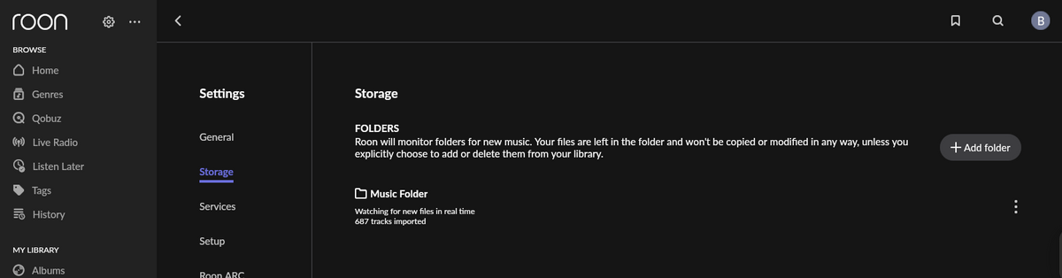 - On your new MacBook Air (the Roon server), click + Add Folder in Roon Storage.