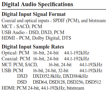 From this, only USB is specified for higher sample rates and DSD support. SACD for MCT means SACD player (encoded with Sony copy protection cypher) only.