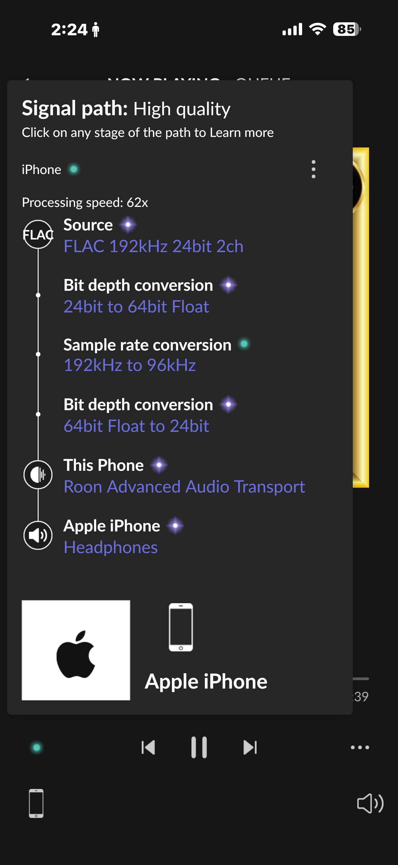 Next are two shots showing the Roon signal path and aptX when play back a 96kHz file: