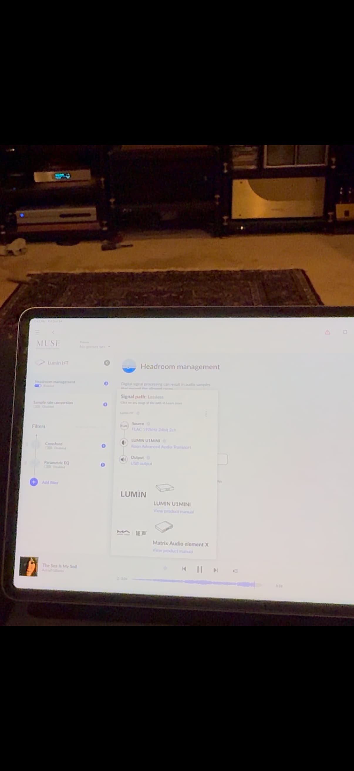 Nucleus One connects to Lumin streamer to PS Audio DAC to Preamp to tube mono amps