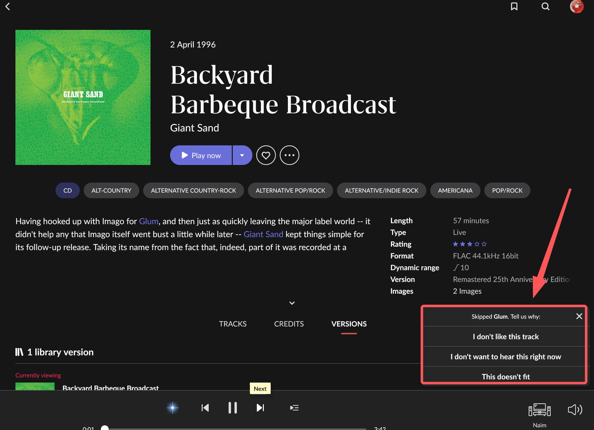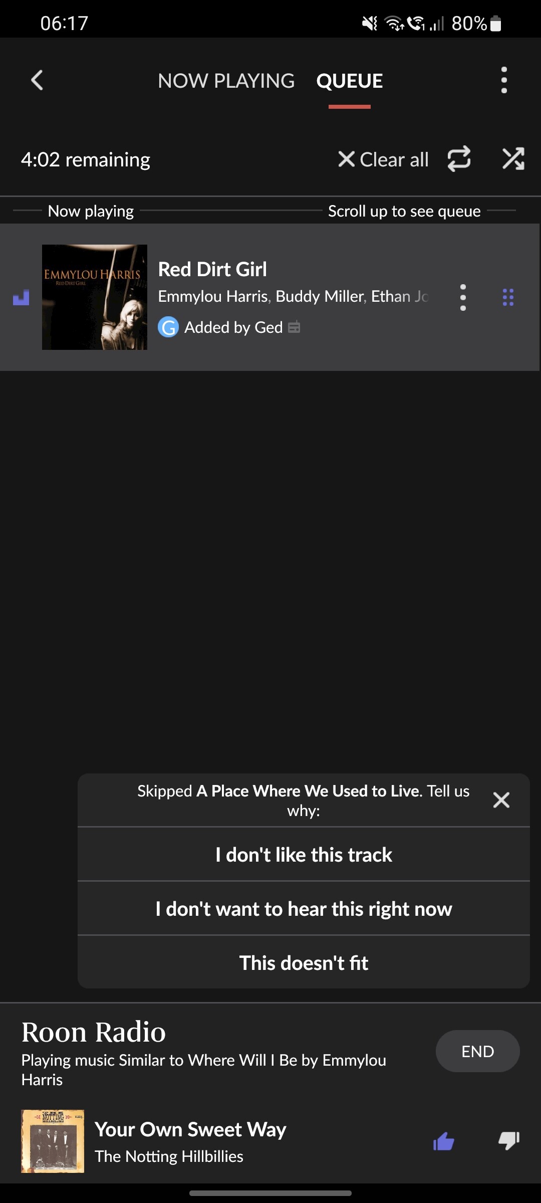 If I skip in Roon radio a track, never noticed some kind of question why or option for classifying a reason. I’m using 99% Android based hardware for Roon, means a mobile or tablet based on Android with the Roon remote app.