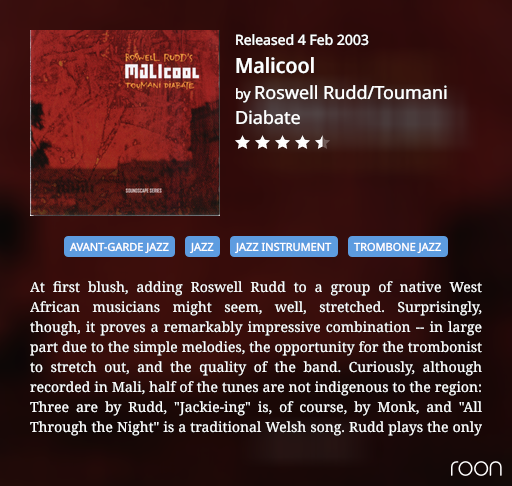 Wonderful recording not ver easy to find but so rewarding. Mix of non-edgy cool avant-garde jazz and west African musicians. Quite unique in a good way: very listenable. Highly recommended
