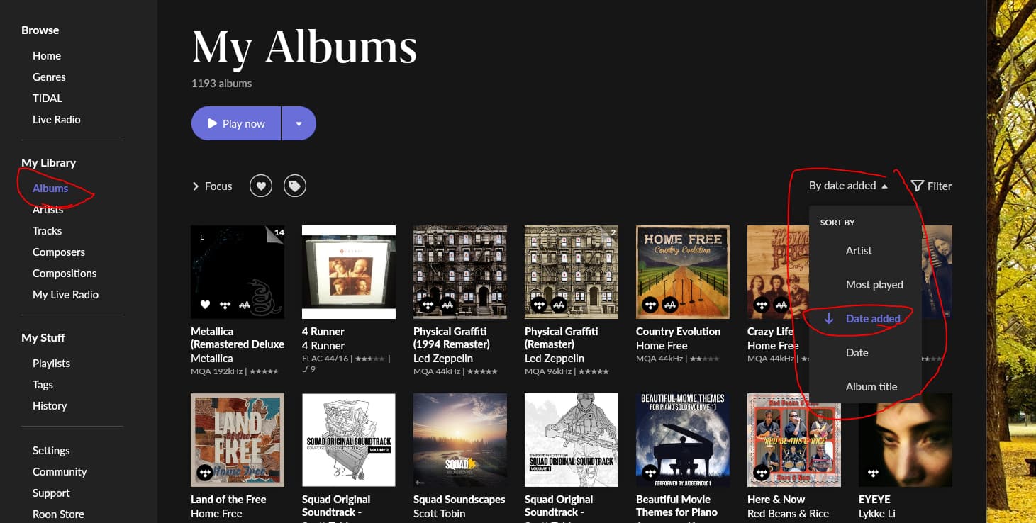 Go to added albums, sort by date added, focus on more things or not, bookmark