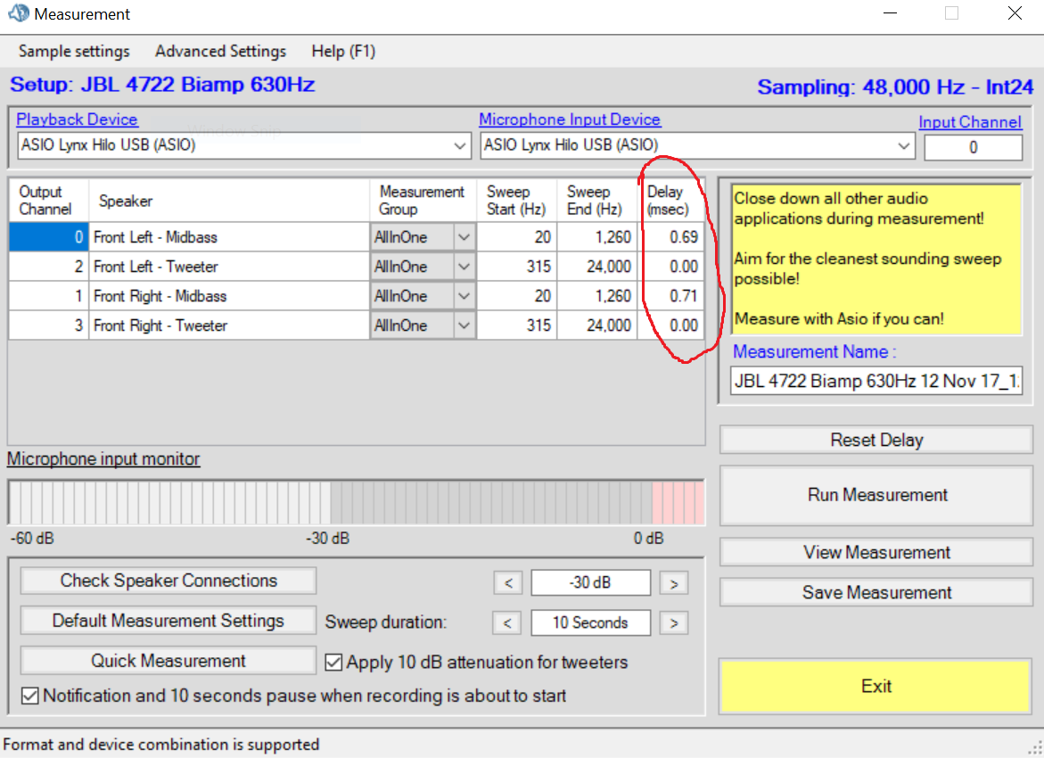 Since TOSLINK in the Asus U7 can only output 2 channels (and most likely the Xonar D2X can only receive 2 channels), a possible option would be to measure in turn (in the order indicated in the instructions), first the bottom left / right Midbass (before that in mixer by turning off the tweeters), then run the tweeters by turning off the midbass, AL even has a separate metering function, and not one after the other in a row.