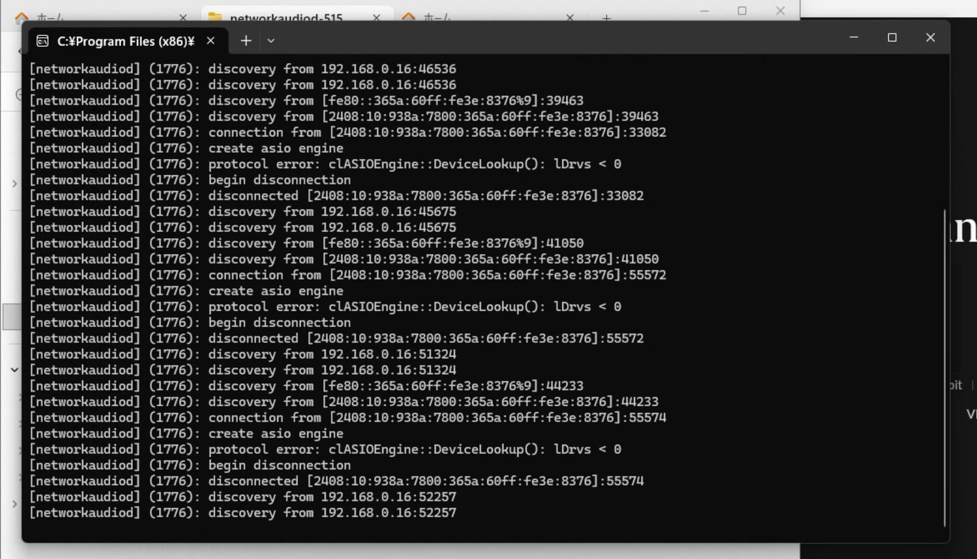 & 2026/01/02 21:31:17 NAA input discovered network audio: name=‘naa-0f3a5899’ version=‘Signalyst Network Audio Daemon 5.1.8’ protocol=‘5’ trigger=‘1’ @[2408:10:938a:7800:da3a:ddff:fee8:3a1a]:43210
