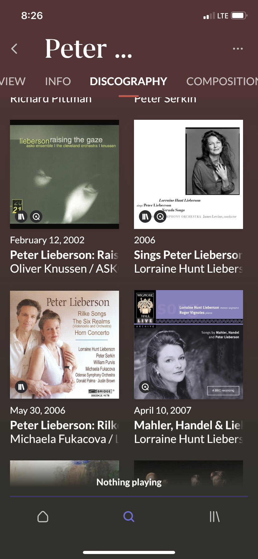 So I go to “Composed by” and click “show more” and scroll down and they show up. Both show as in my collection. So if they are in my collection and also on the Lieberson Composed by page, why aren’t they showing as in my library? I have lots of local classical, and things get lost rather quickly.