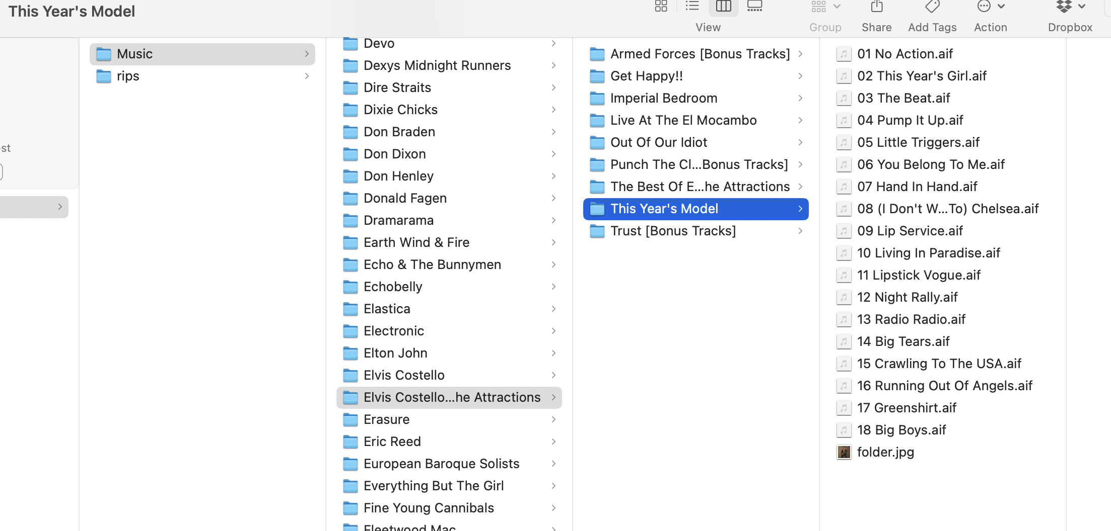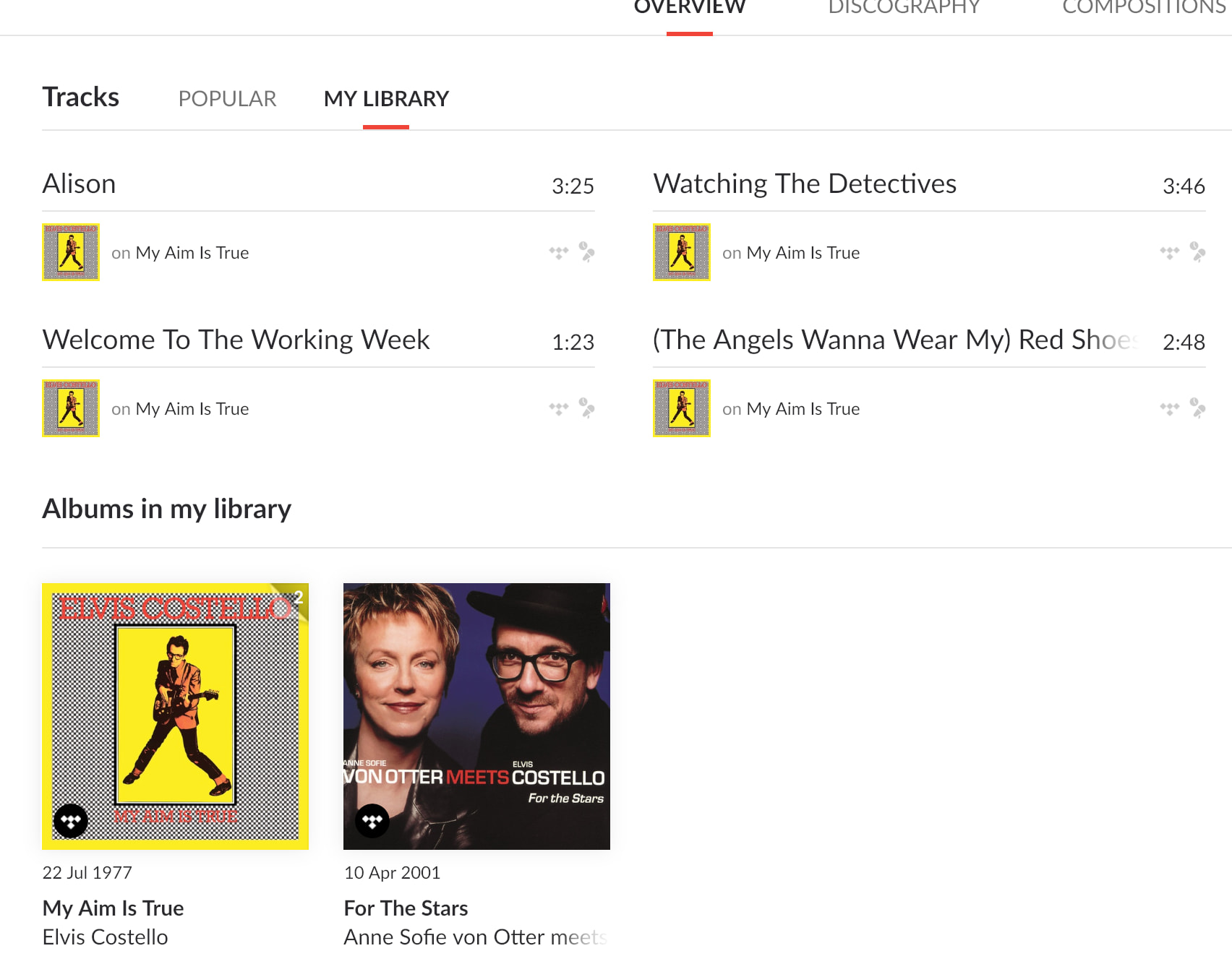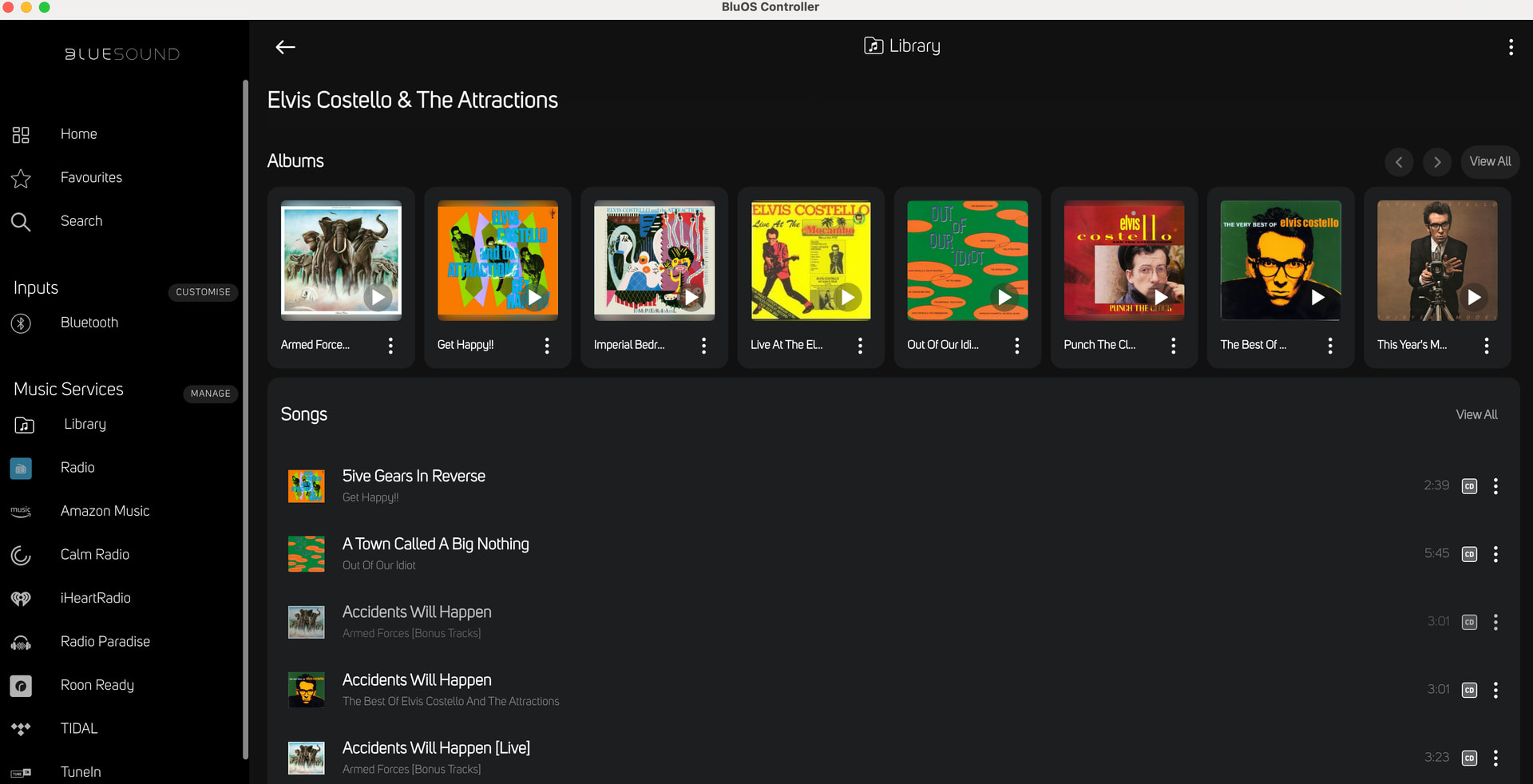 Hi, sorry for delay. So in my bluesound library I have numerous albums from Elvis Costello (some listed under his name, some listed under EC and the Attractions). You’ll see from my screenshots that on roon it only has 2 of his albums. All music is in same folder on bluesound player, all songs are .aif. Thank you.