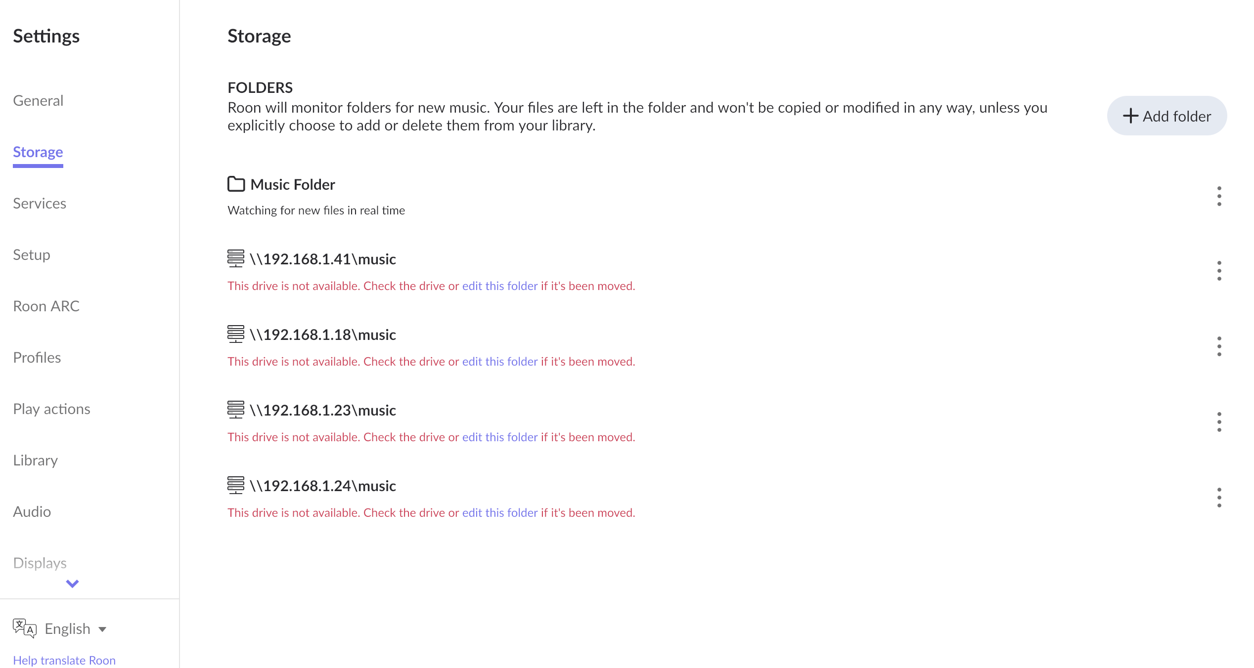 Edit the Path: In Roon (Settings > Storage), click the three dots next to one of the disconnected folders and select Edit.