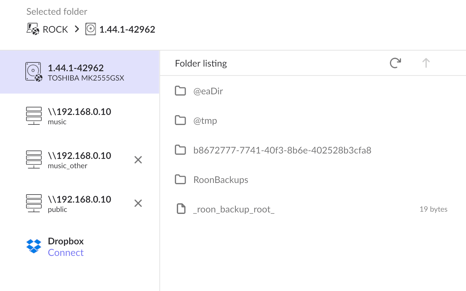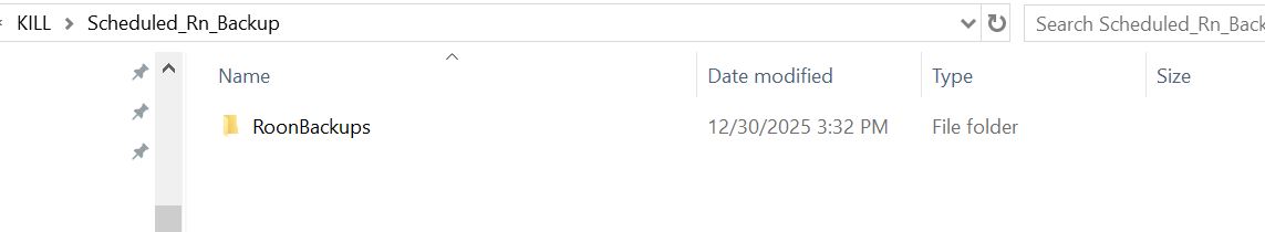 - The backup was set. If I then browse to the actual file system you will see that, creating the backup has created the RoonBackups directory in that location.