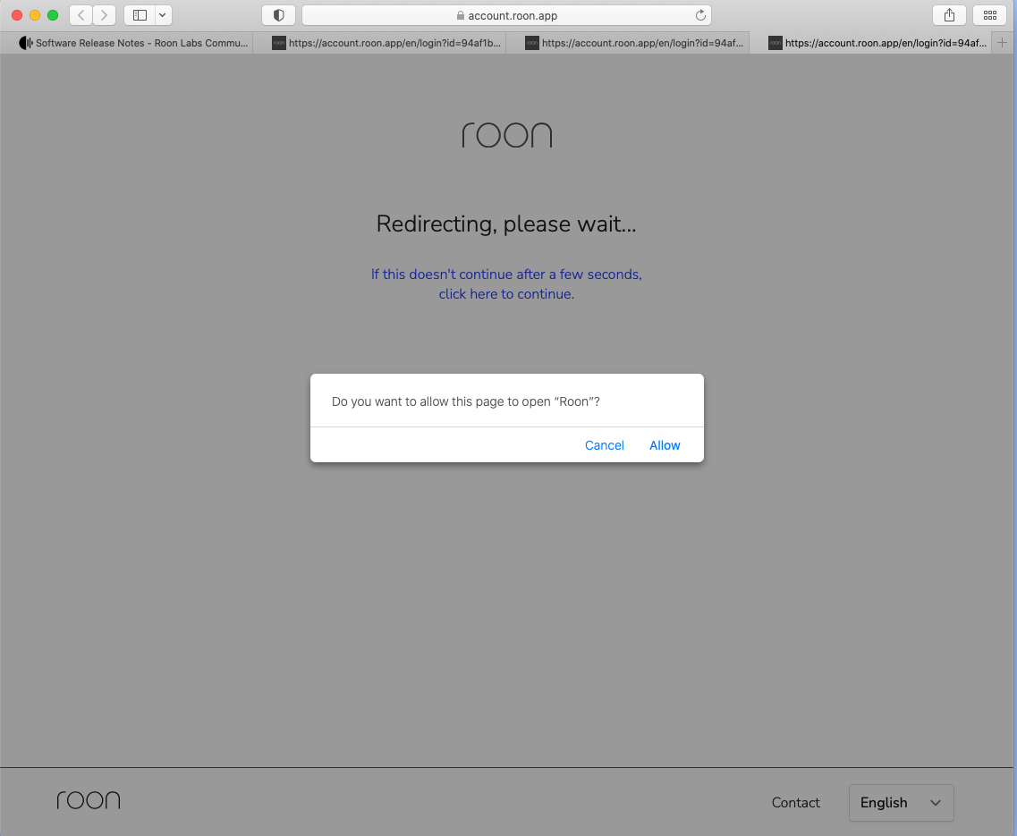 Have you been redirected to [https://account.roon.app](https://account.roon.app) (the Roon login page) in your browser?