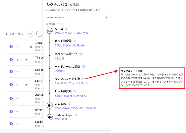 表示されている 176.4kHz → 88.2kHz のサンプルレート変換 は、Roon の MUSE 設定ではなく、macOS 側のオーディオデバイス設定(CoreAudio)によって行われています 。