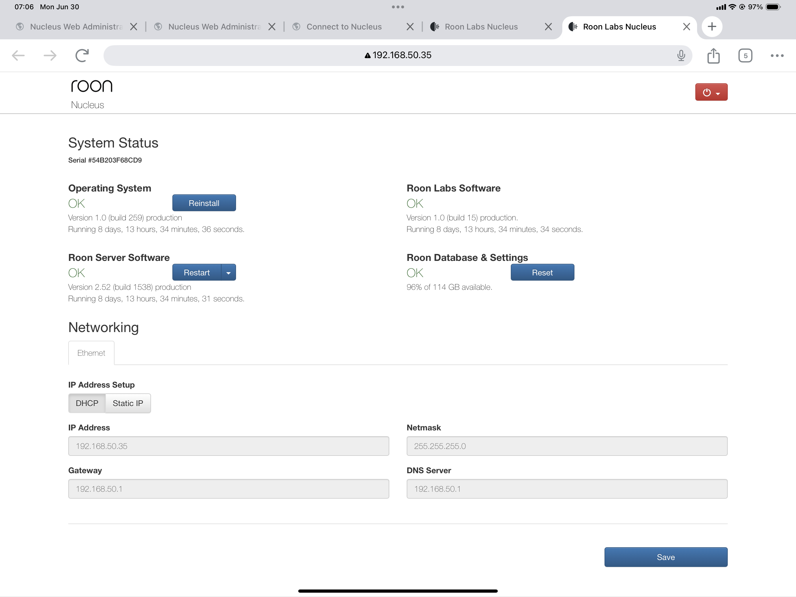 When you have a moment, could you please send us a screenshot of the Web Administration page for your Nucleus? If you need help accessing that page, you can follow the steps outlined in this article.