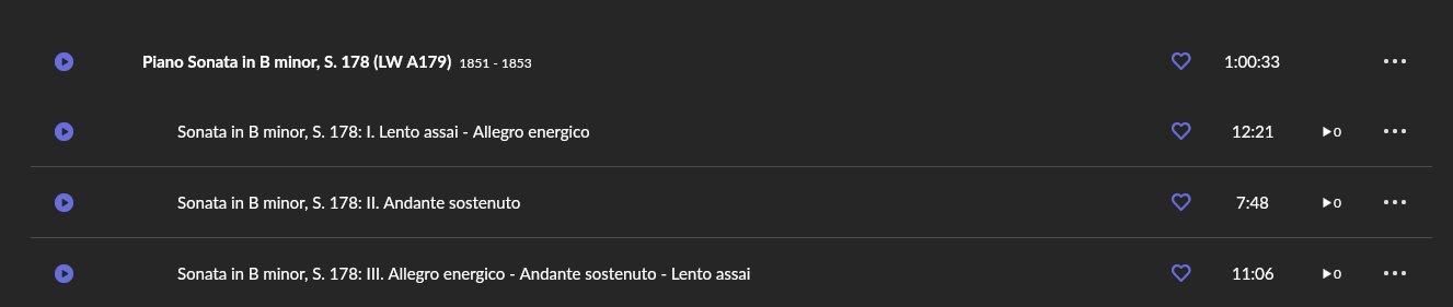 there are 2 recordings of Liszt Piano Sonata in the set (Disc # 77 analogue & 78 digital ) , both report a total time of 1:00:33 whereas the sum of the movement timings is more like 30 mins