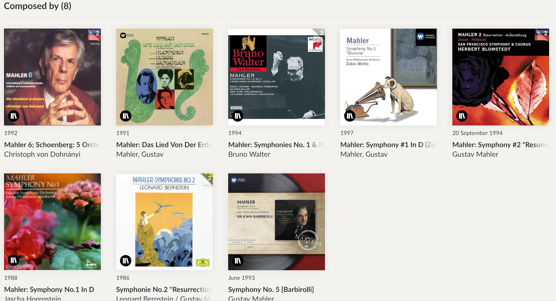 Here’s what I get by searching for “mahler”, clicking the composer link, and then scrolling down to see albums. Notice that the Zubin Mehta performance of the 1st Symphony is there, but not the 2nd.