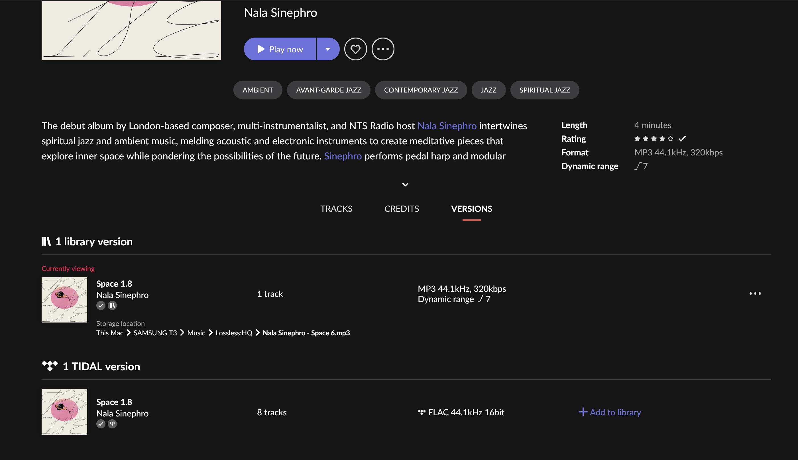 Issue can be seen below…I have track ‘space 6’ in my local library but would like to view the whole album (on tidal) without having to go to ‘versions’ every time: