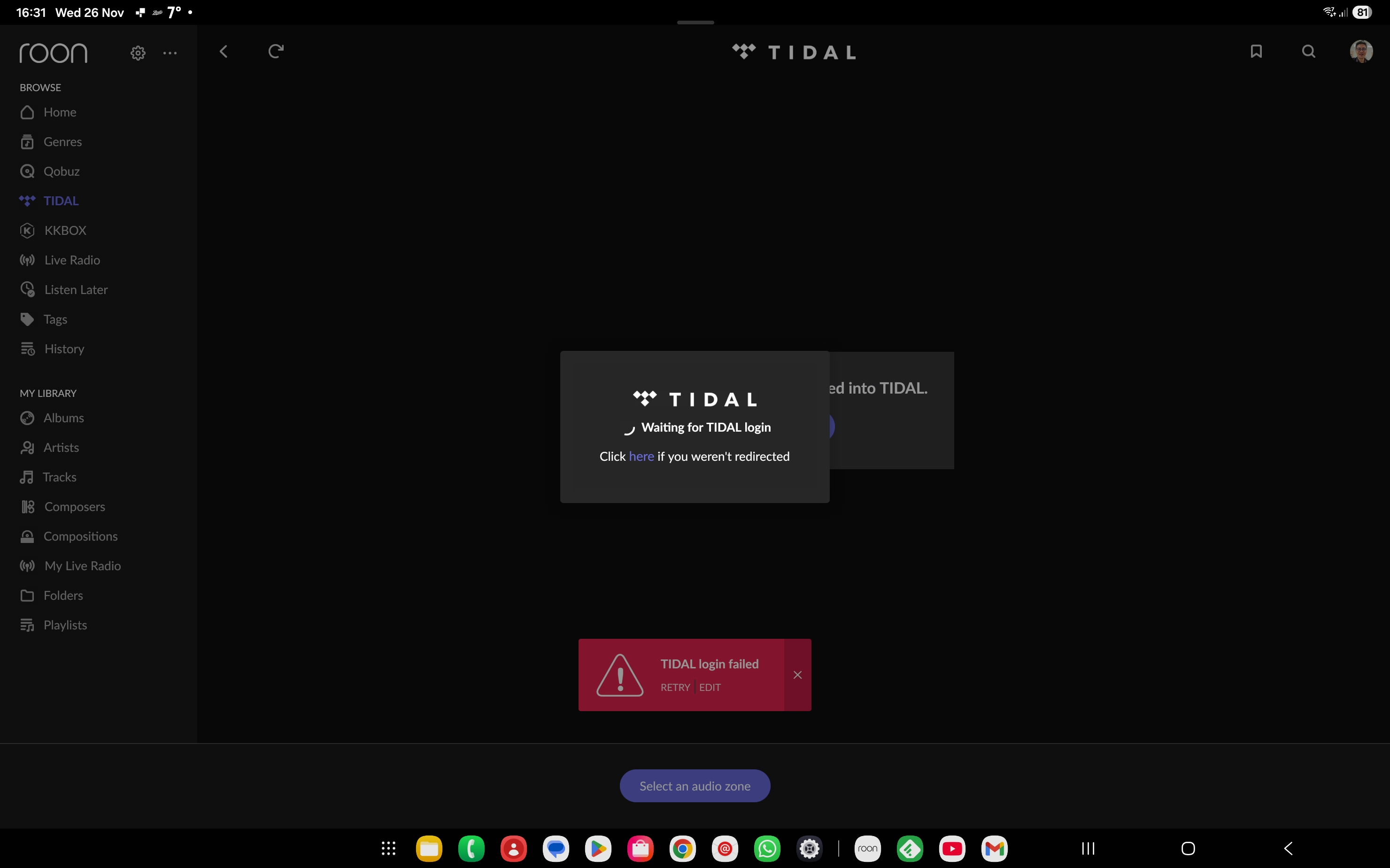11/26 16:10:55 [Local 11/26 16:10:55] Debug: [easyhttp] [235] GET to https://api.roonlabs.net/oauthcb/3/kkbox/check?tid=4afa4965-2453-4d7d-a2de-f92e5799286d timed out after 30001 ms