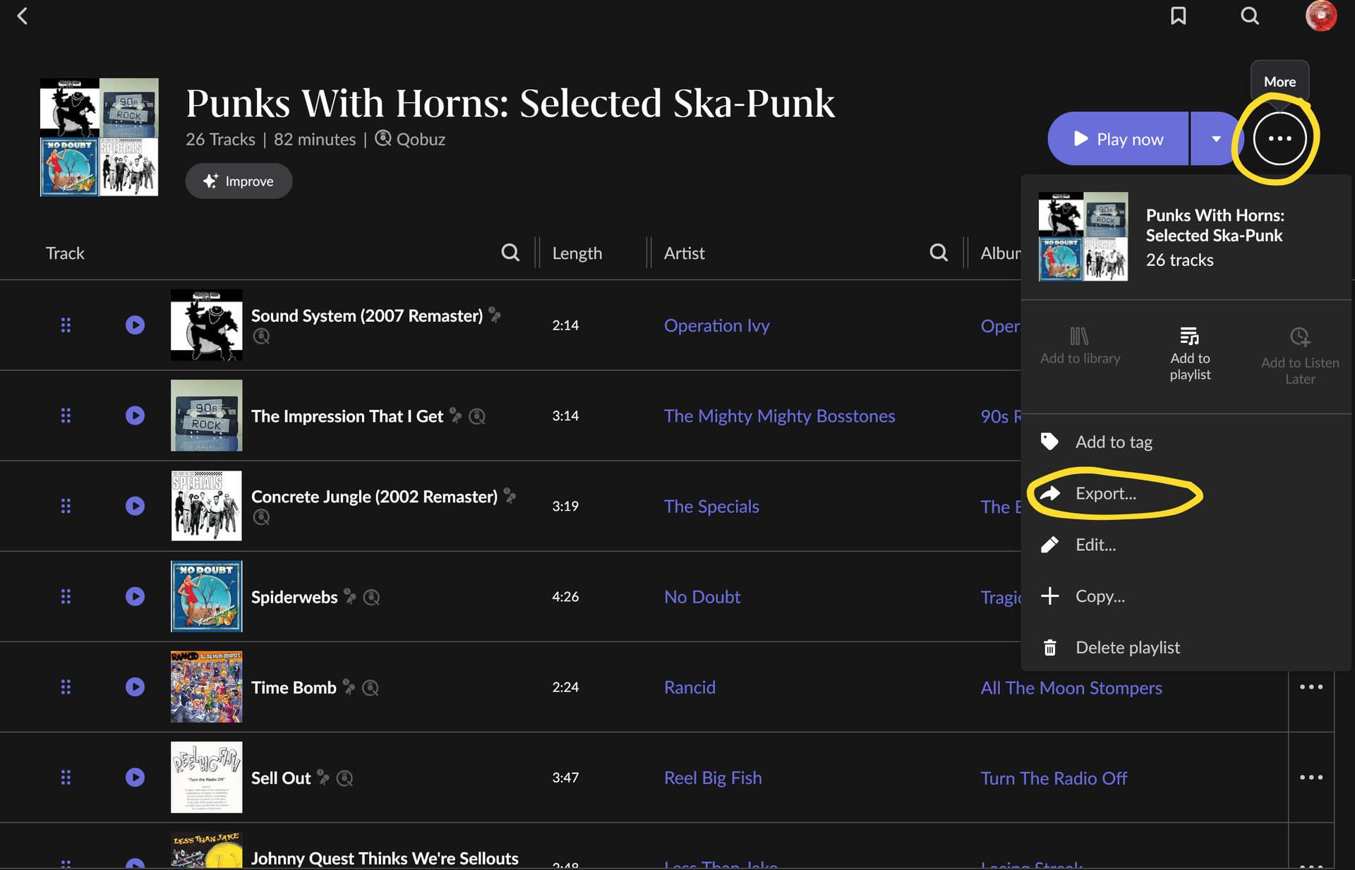 You can go to the playlist, click the (…) button and export the list as an Excel file (or as a CSV file that can be used for exporting to the Soundiiz service. CSV means Comma-Separated Values, it’s just a text file where fields are separated by semicolons or commas. Excel and various other spreadsheet programs can import those, too.)