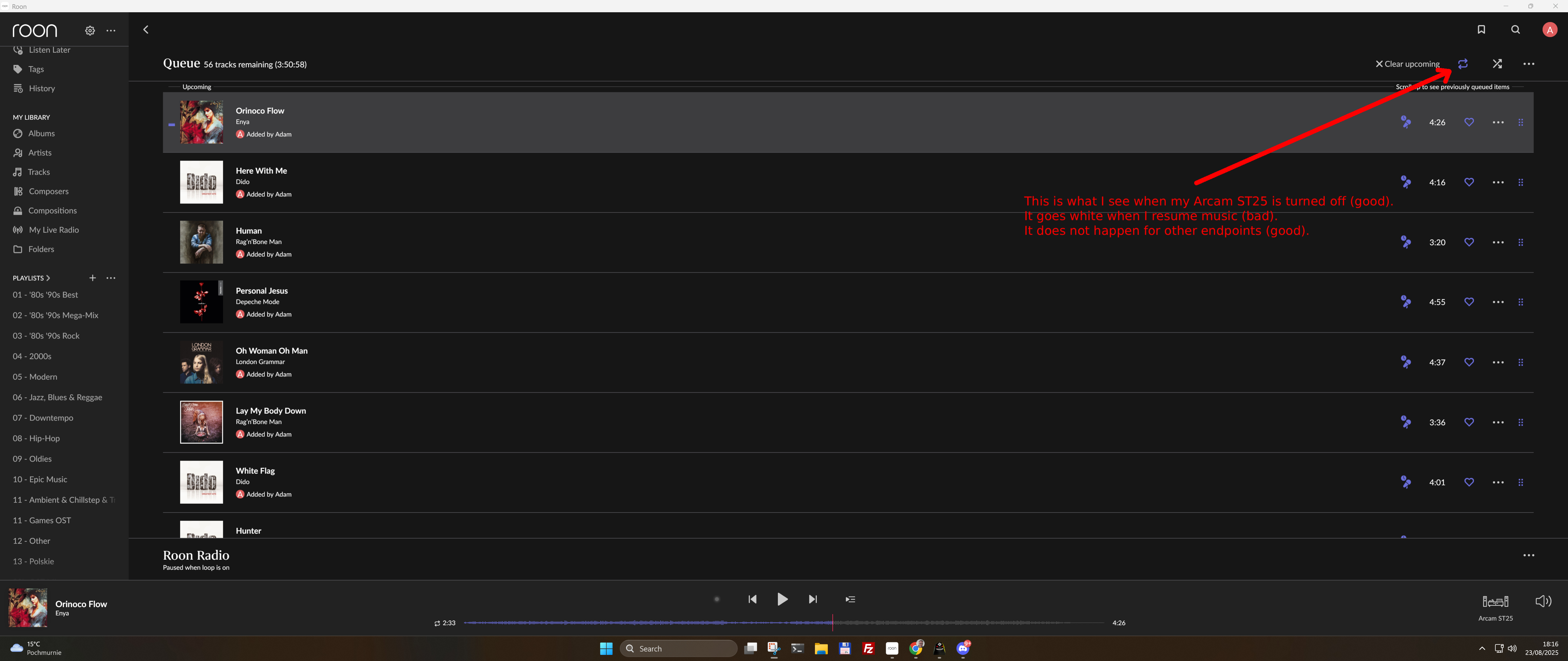 Hi, I am having issues with loop playback. When I use my Windows PC, Raspberry Pi (HiFi Berry OS), or Arcam ST25 via AirPlay, it preserves loop playback without issues. I select my playlist, pick shuffle, click loop in the queue, and that's it. Every time I resume playback, it is still looped. However, it does not work with Arcam ST25 as a Roon Endpoint. When I stop playback and ST25 goes off, I can see the loop still turned on in the Roon app. Sadly, when I resume the playback, it instantly goes off.