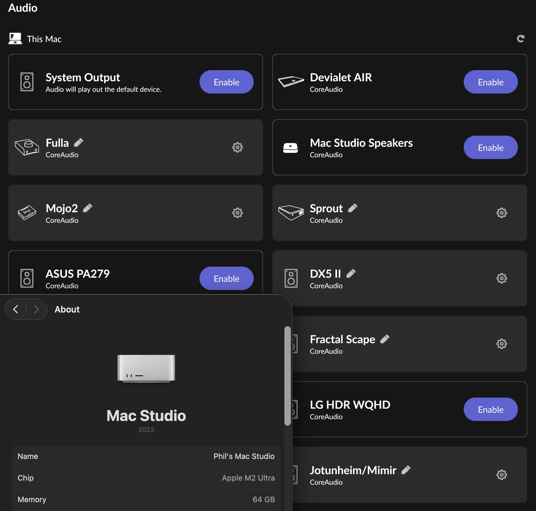 · I have several Macs running on my local network with attached endpoints. Roon confuses one of them (a MacBook Air) with the Mac Studio I use for most of my streaming; when I open Roon on the MBA, in Settings --> Audio, "This Mac" shows the devices connected to the Mac Studio and devices I connect to the MBA (DACs) don't show up in the Audio tab on either the Mac Studio or the MBA.