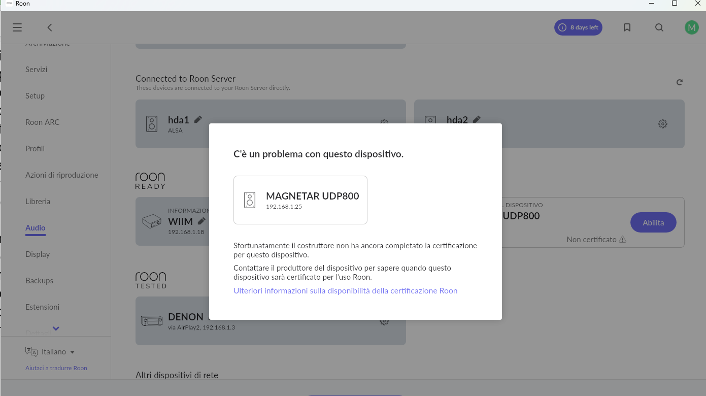 I installed roon server on NAS QNAP TS251A but when I go to enable the devices it sees my MAGNETAR UDP800 MKII but it does not let me enable it because it says that for this device there is a problem because the manufacturer of the device has not completed the certification
