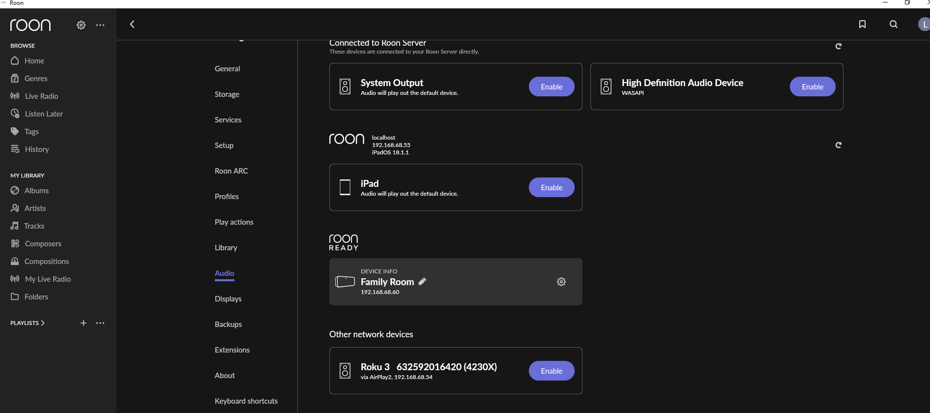 Roon Server is running on a dedicated HP Workstation tied into my LAN. Roon Server appears to be working normally. I even deleted and reloaded a new instance of Roon Server from scratch to determine if the reload would allow for "Main System" to be identified. Didn't work.