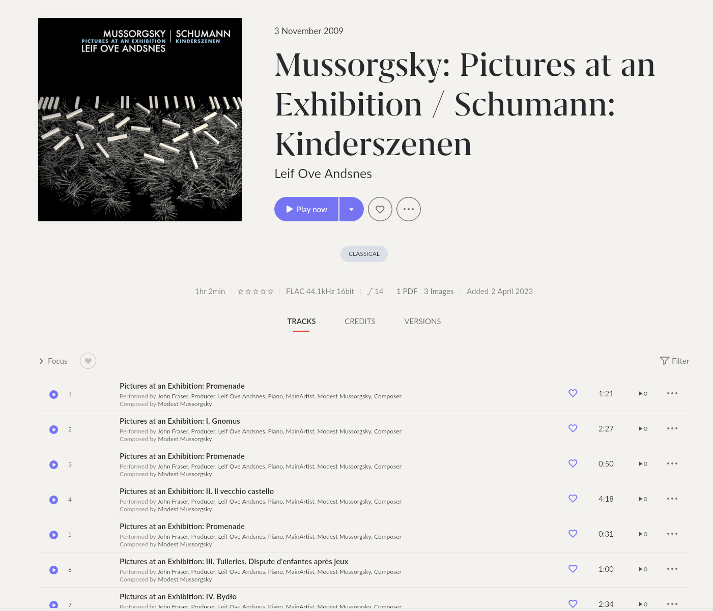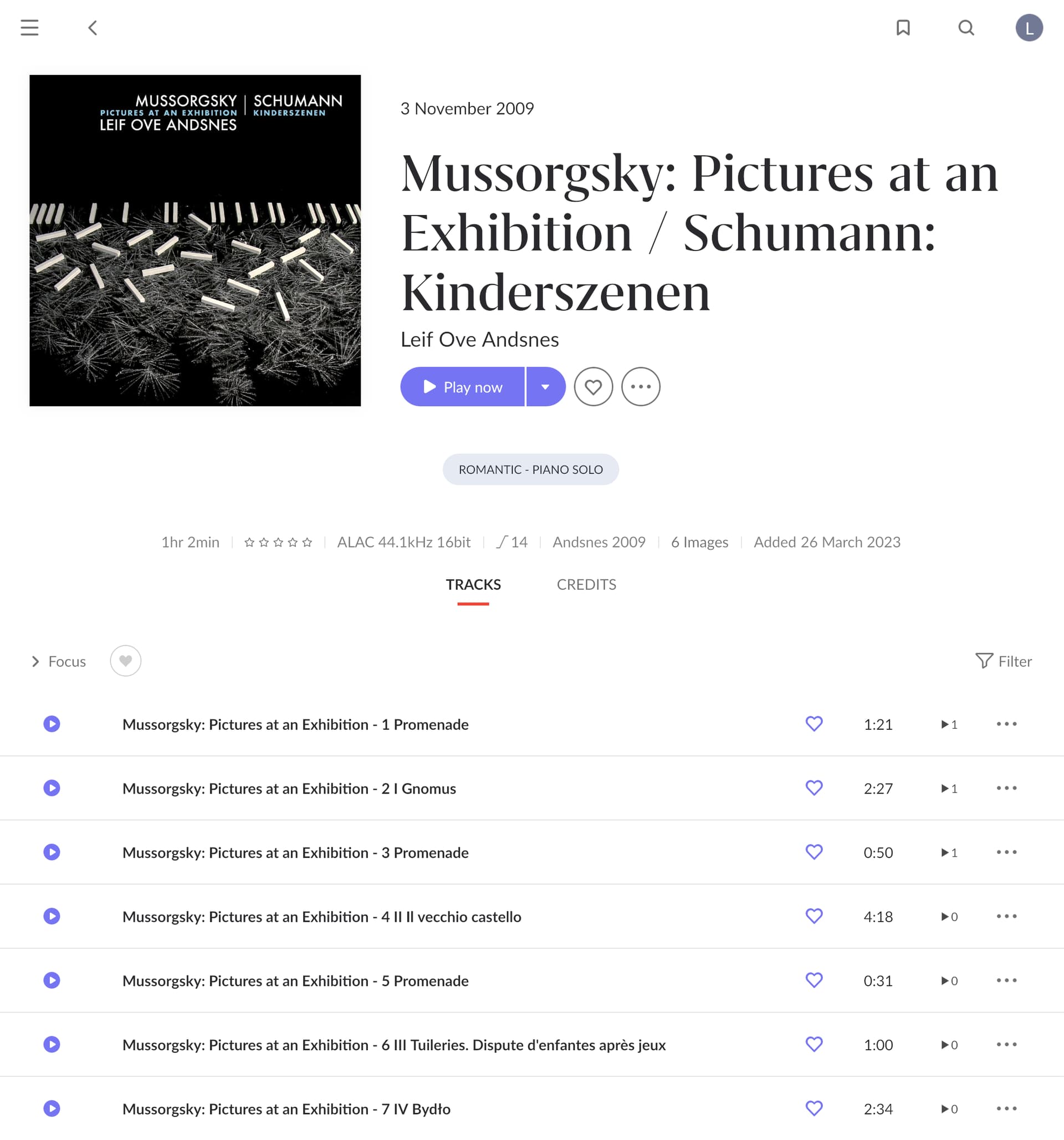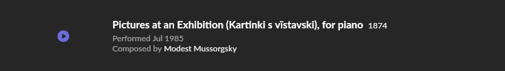 The problem is that the source metadata has not allowed Roon to recognise the Mussorgsky as a single composition. If you have this album as a local set of files, then you could group the individual parts into a single work and tell Roon that it is this one: