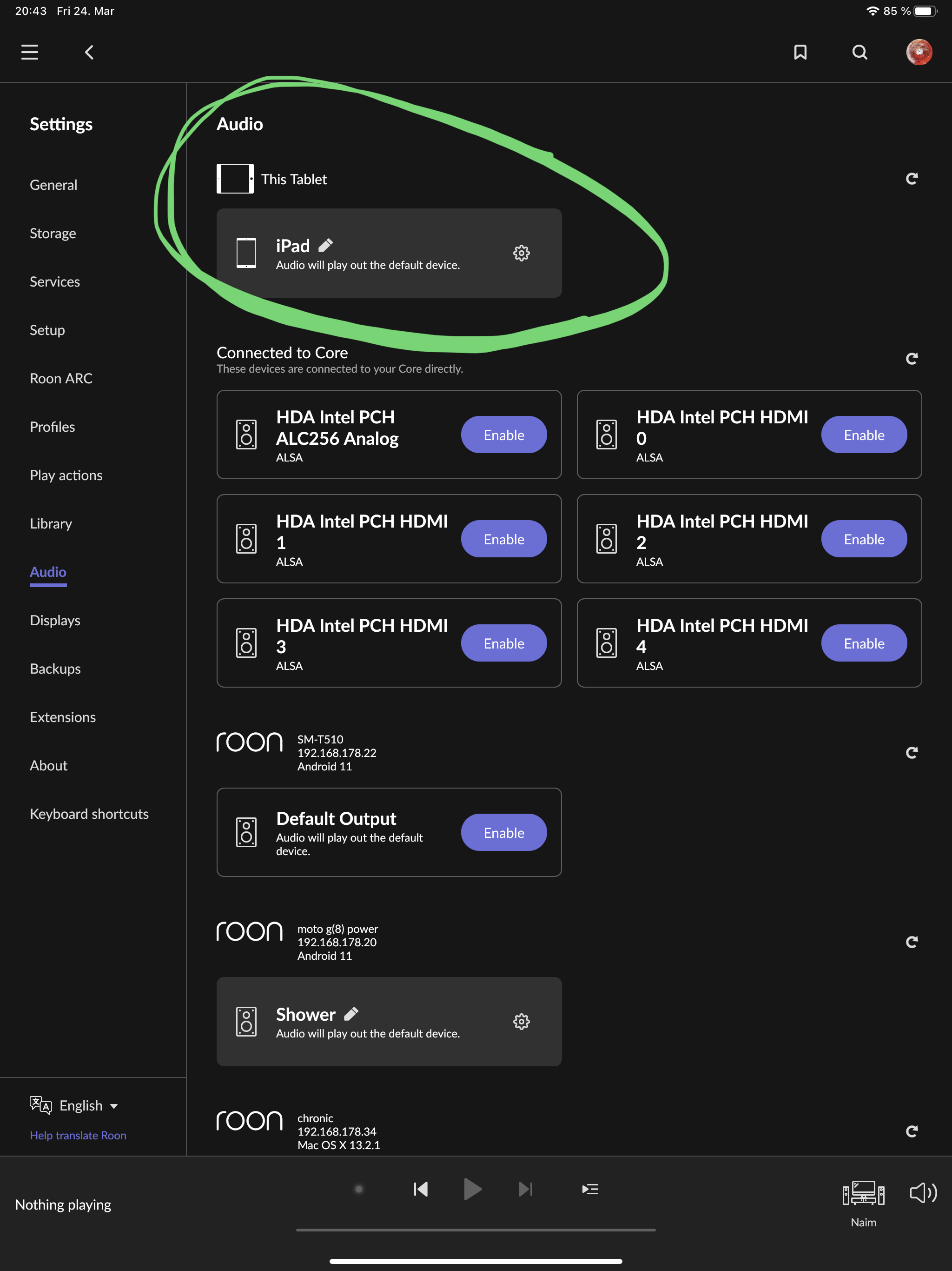 I followed the instructions as you recommended and after reinstalling the app and opening Roon and selecting the new core, I have absolutely no audio devices available, nor any music since I have not restored any backup. I’m wondering if I did something incorrectly?