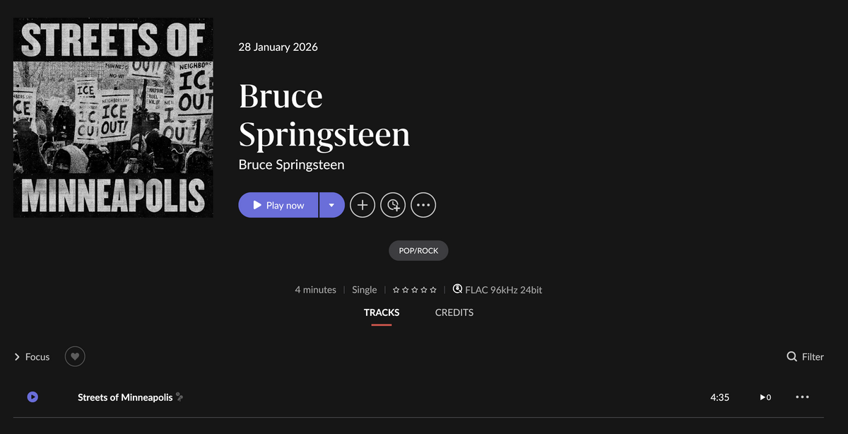 · New Bruce Springsteen track "Streets of Minneapolis" will not populate in search and does not appear in playlists even once I've manually added the song to Qobuz playlists directly via Qobuz.