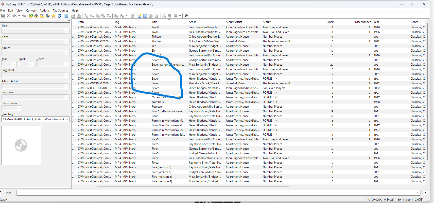There is one thing that still puzzles me, though. It’s the difference in how Roon displays “Seven” in the Composition List. For clarity, let’s call the ones that appear “Type A” (2 tracks in my library) and the ones that don’t “Type B” (4 tracks in my library).