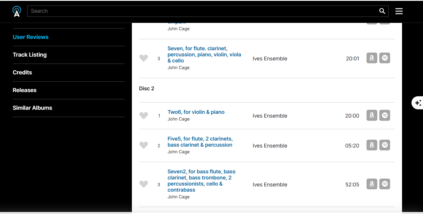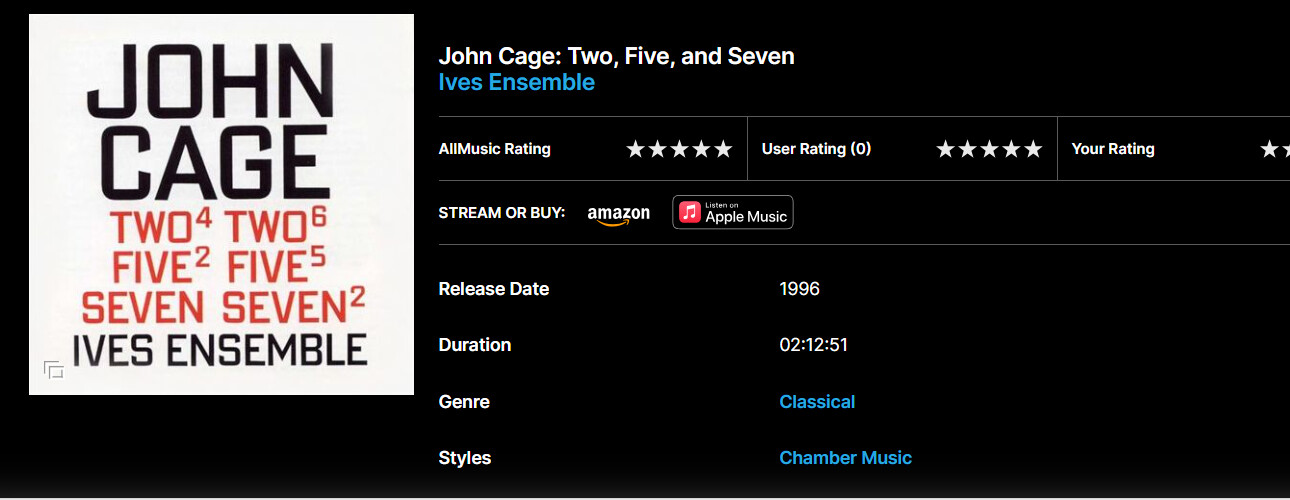 You have picked an unfortunate example with John Cage. You will find that roon struggles with Classical composers not following straightforward naming or catalogue conventions. Those two “Seven”s are two different compositions. Cage just added superscipts to differentiate, so one is Seven and the other is Seven2 . Roon does not follow this naming convention, instead it uses the naming convention of Tivo, one of its metadata suppliers, so its Seven and Seven2. You can find the WORK titles roon is trying to match against on allmusic.com which also uses Tivo: