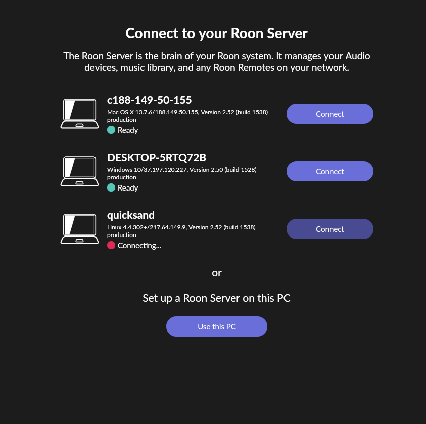 My roon remotes (windows and android) are normally connecting to my Linux based server but since a few days the server is not found anymore. Yet, the log shows connection attempts to all sorts of other servers across the world! And it shows even their computer host names and their locally assigned IP addresses it is strange. I cannot access my own server but two nights ago it was fine and have not changed anything to the setup as far as I know. Importantly, ARC is working fine. I have used the easy installer and have let the server run updates as prompted.