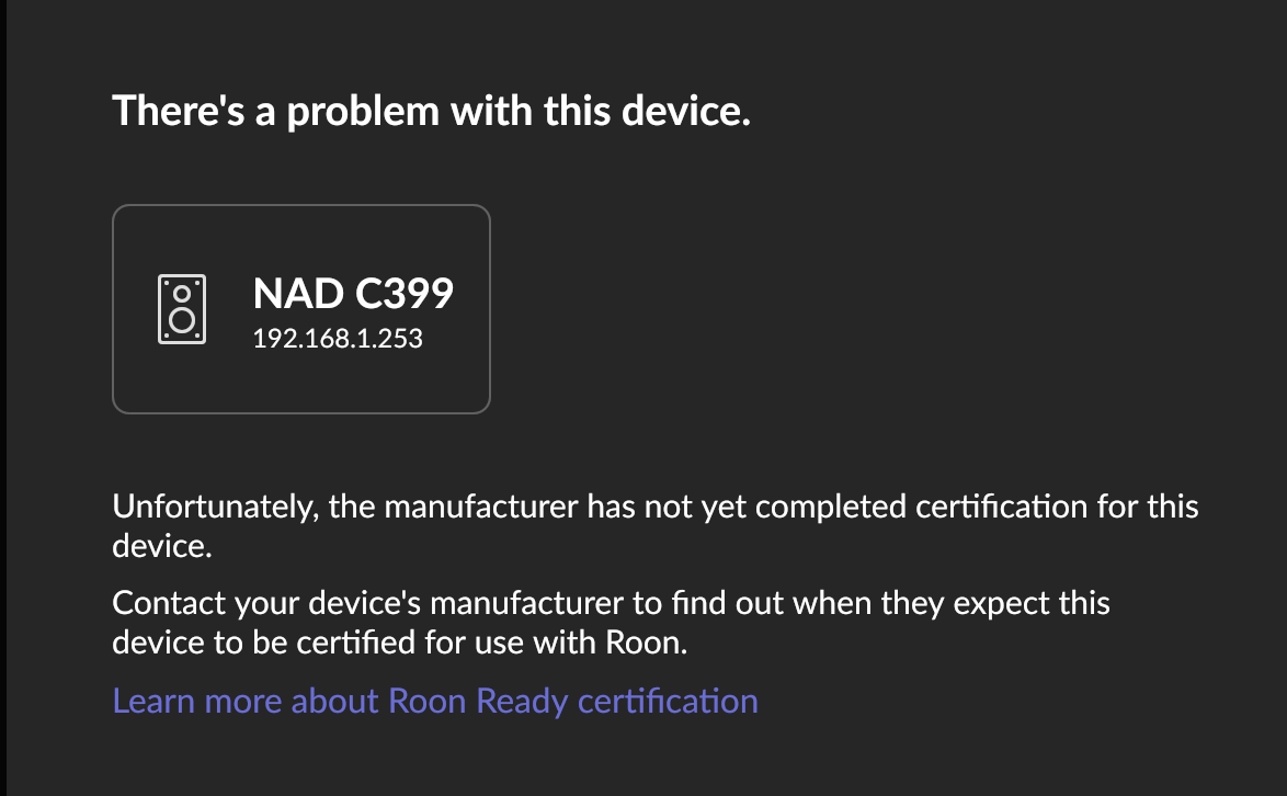 During that entire period it was shown as Roon Ready on the websites that keep getting linked in this thread. Also during that entire period the error message in the post by another poster above was consistently shown when trying to connect. “Not Roon Certified please contact your manufacturer” which I did and they said they were working on the problem with Roon but could not give me an expected resolution date.