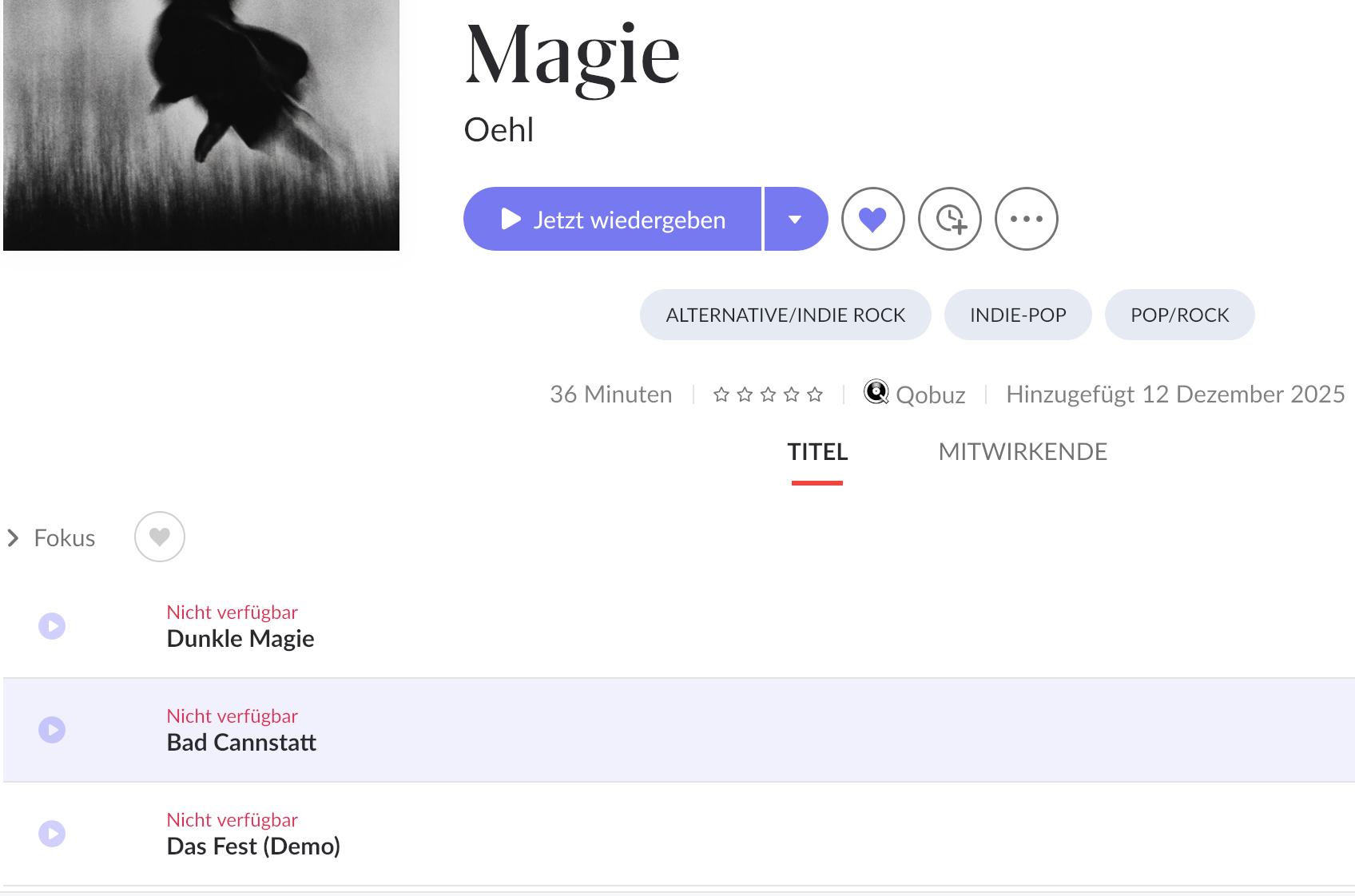 · A new album by Oehl (“Dunkle Magie”) was released today. It is the “Album of the Week” on Qobuz, but it doesn't even show up on Roon. (Not even after restarting.) The album appears in a manual search, but cannot be played (“not available”), even though it can be played normally on Qobuz. What´s going on?