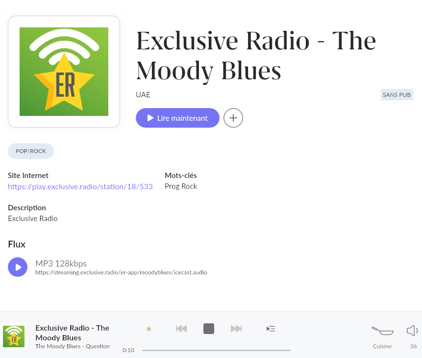Stream has no metadata but they can be sourced from the station, merged to the stream and displayed in Roon https://play.exclusive.radio/station/metadata?metadata_url=https://metadata.uber.radio/playing/api/Playing/er_Moody_Blues_-_HITS