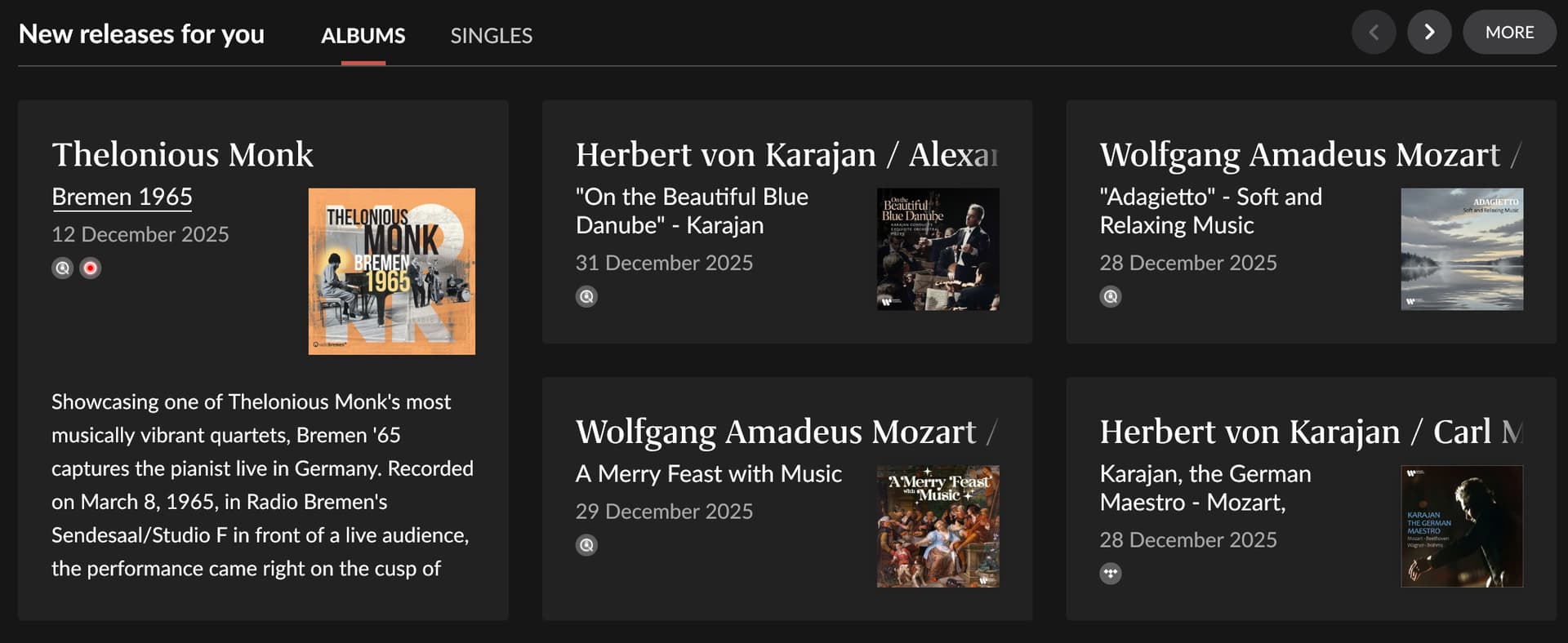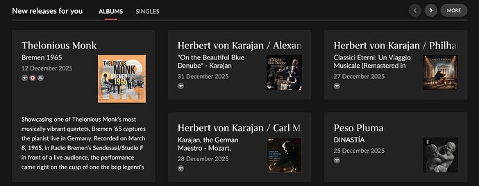 Same for me. I have a grand total of four classical albums in my library and I currently have 18 classical album recommendations in new releases for you. Annoying. If my mother couldn’t turn me on to classical music, I’m pretty sure that Roon can’t either!