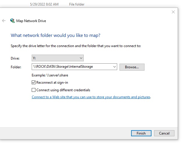 How you do this depends on the OS you’re using, e.g., MacOS, Windows, or Linux. In most cases the address is smb://rock.local/Data.