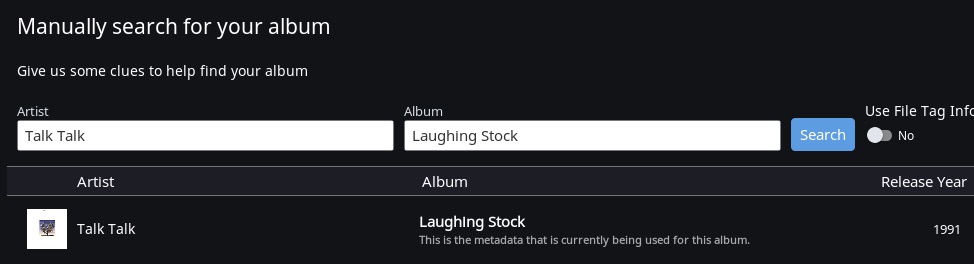 If I manually re-identify the album, it finds the match and it show a thumbnail of the proper cover art, but when I click Save, it reverts back to the generic/placeholder art. If I go to Edit Album, Album Artwork, all choices indicate no image. I can manually upload the proper image and it will save and display as expected. I’ve removed and re-added 2 of the 4, this time Roon reported it was taking longer than expected, will continue in the background. Manually re-adding a few minutes later, the add completed, unfortunately, the problem remains with the re-added albums.