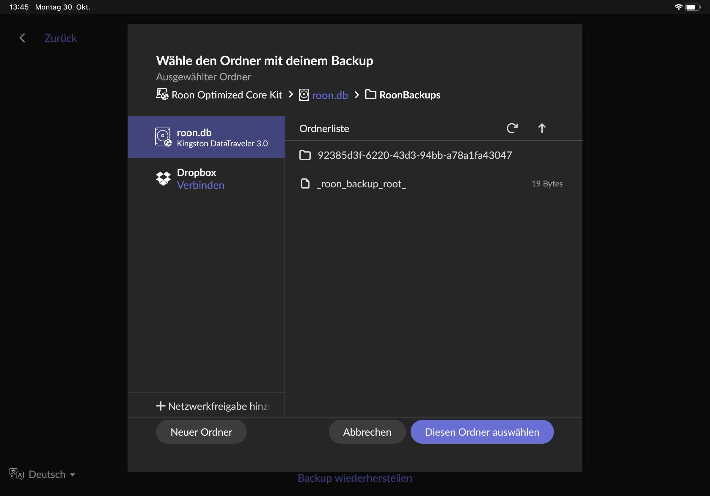 Hello, i wanted to move with my roon core to another device. I made a backup of my database on the old device, but by trying to import the backup on the new device i receive the message “no database found on device”. but it is on the device i saved the backup.
