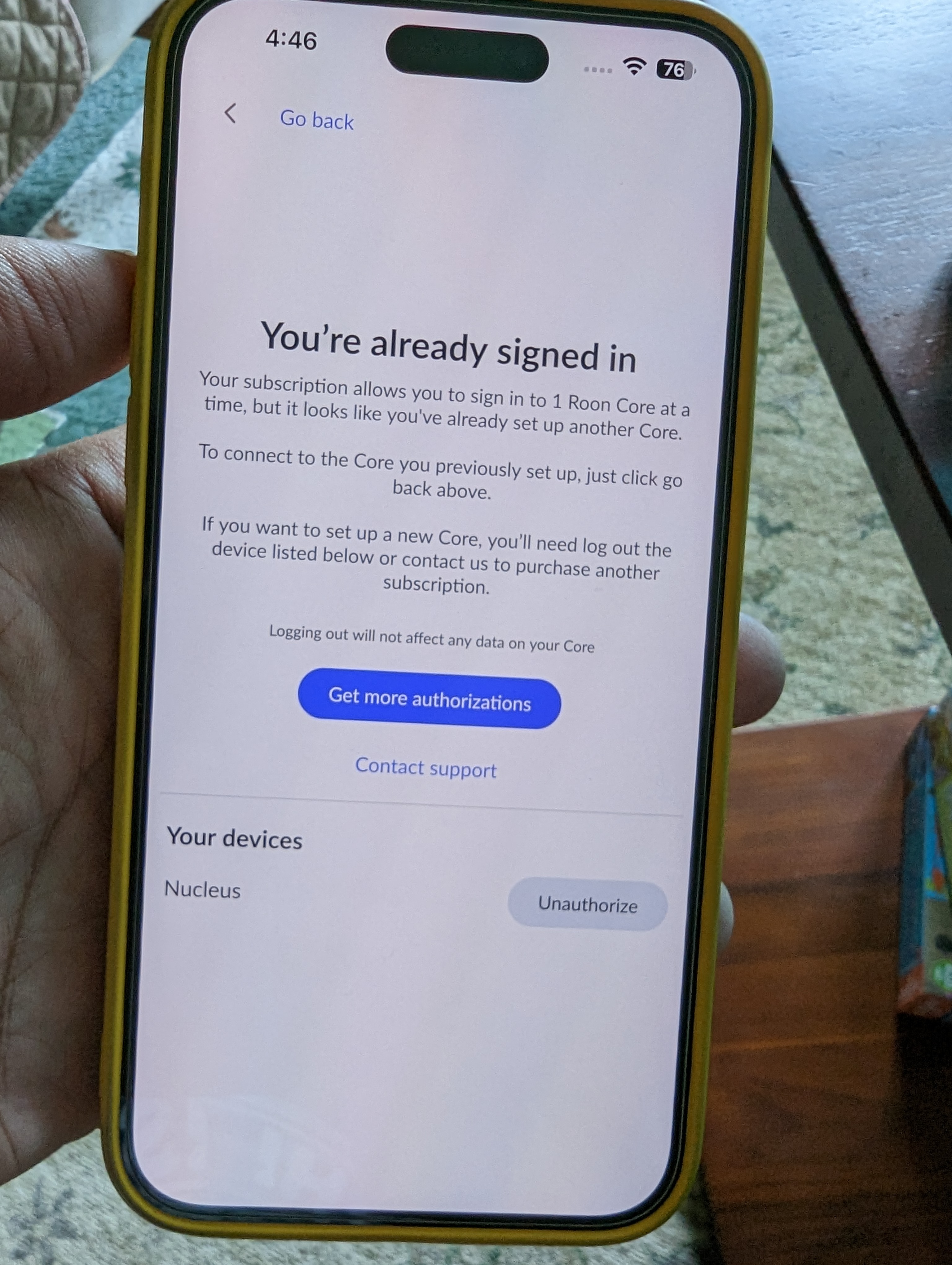 Click on “Unauthorize”, and then reselect the Nucleus when chosing your core.