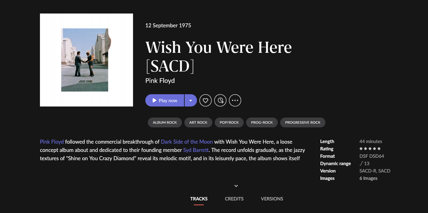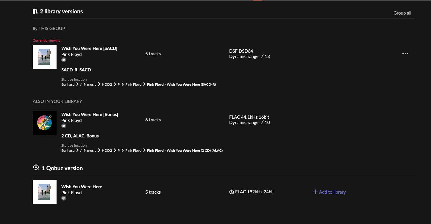 Navigating by folder i found the DSD version, tagged it and grouped the tracks and had ROON identify it as that album (SACD), But it doesnt show up under ARTIST / Pink Floyd at all. But I can find it in Search “wish you were here” as the correct version taggad correctly, but why the h**l doesnt it show up as an album in the pink floyd discography filtered excluding Qobuz results? If I filter including Qobuz it shows up (But Qobux does not host any SACD albums)