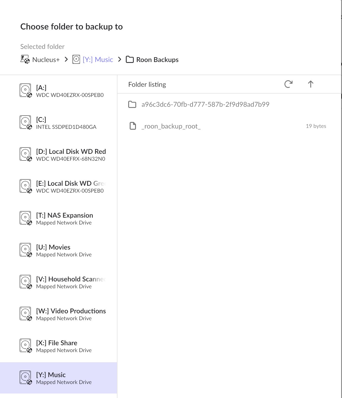 “Y” Music > Roon Backups is completely valid as a folder reference and it doesn’t matter where I route the backup location to. When it comes time to actually do a scheduled or force a backup, Roon produces the message “Backup failed at (time) / Backup directory not available”. I assume that this is because of the “Nucleus +” wording at the beginning of the path.