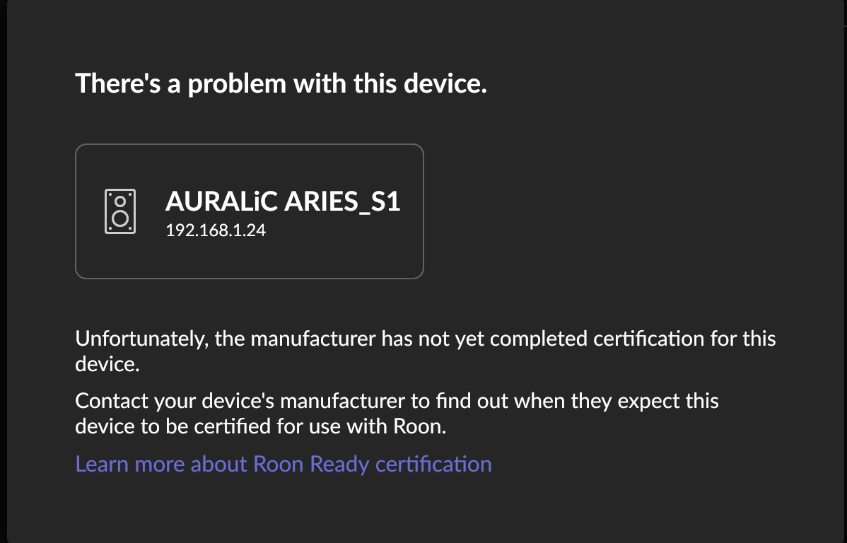 I have just purchased a Nucleus One after an old NUC stopped working. I was using my Auralic Aries S1 previously and it worked fine. Now the new Nucleus One will not work with the Auralic saying it is uncertified. What can i do?