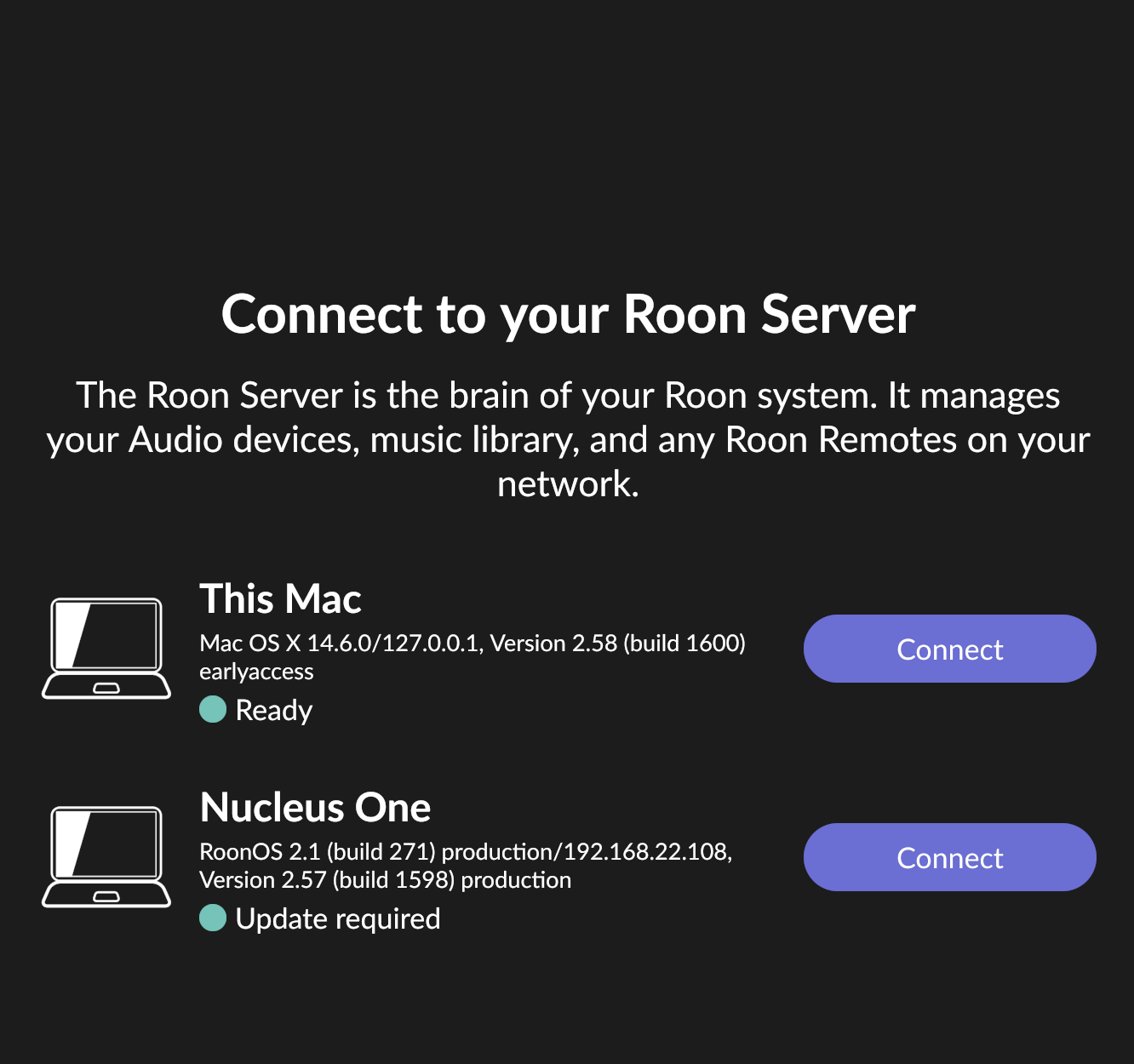 @Brian_Kelly You appear to have a mixture of Early Access and Production builds of Roon on your devices. So the Early Access version of Roon on your Mac is finding the Production build of Roon Server on your Nucleus and complaining that it needs to be updated.