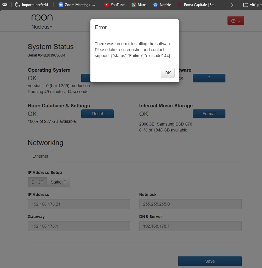 This and similar things happened before, and the problem in the past was always with Roon’s cloud servers. Most likely it is the same now, and most likely a related cloud server issue is causing the exitcode 44 when trying the reinstallation.