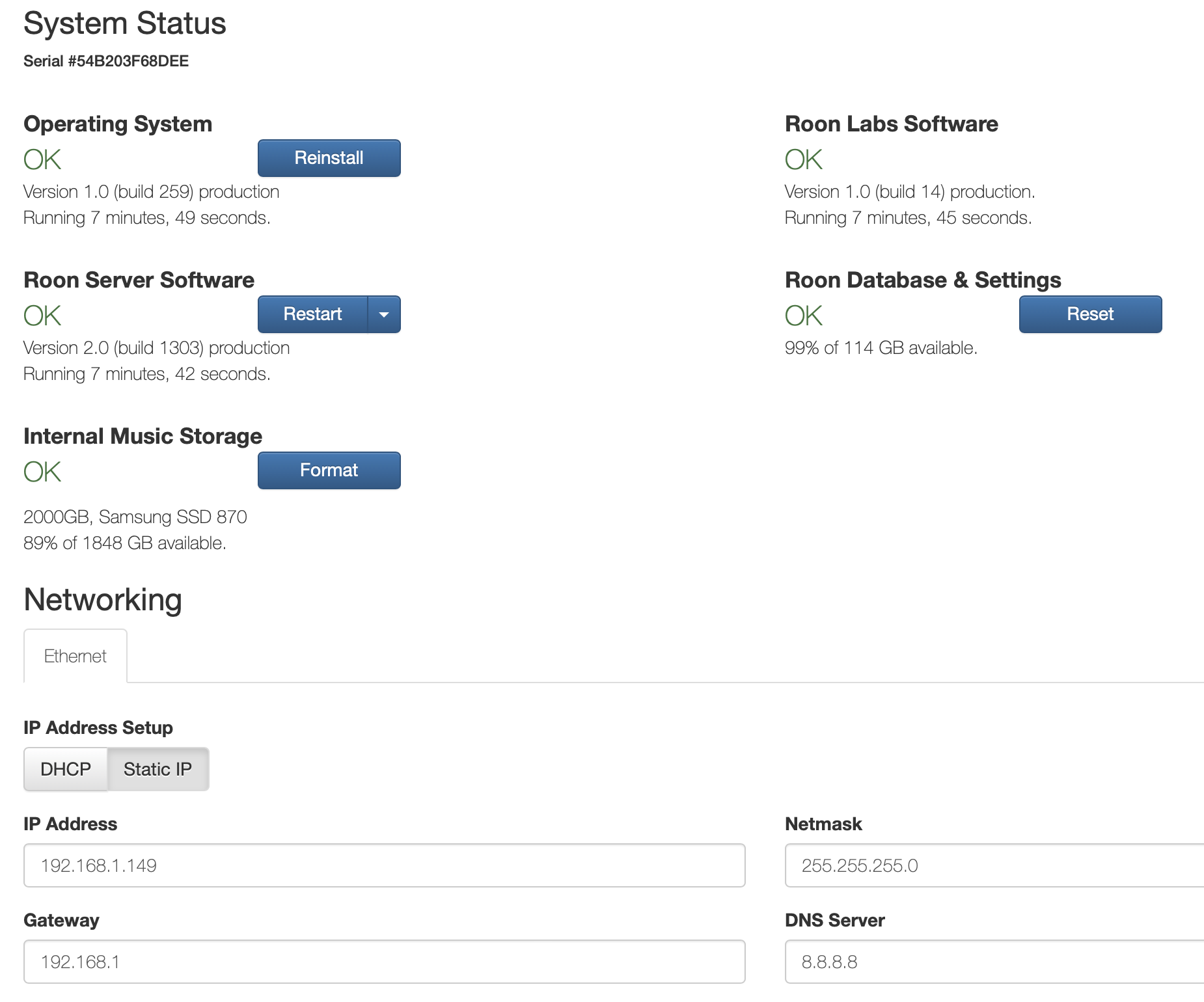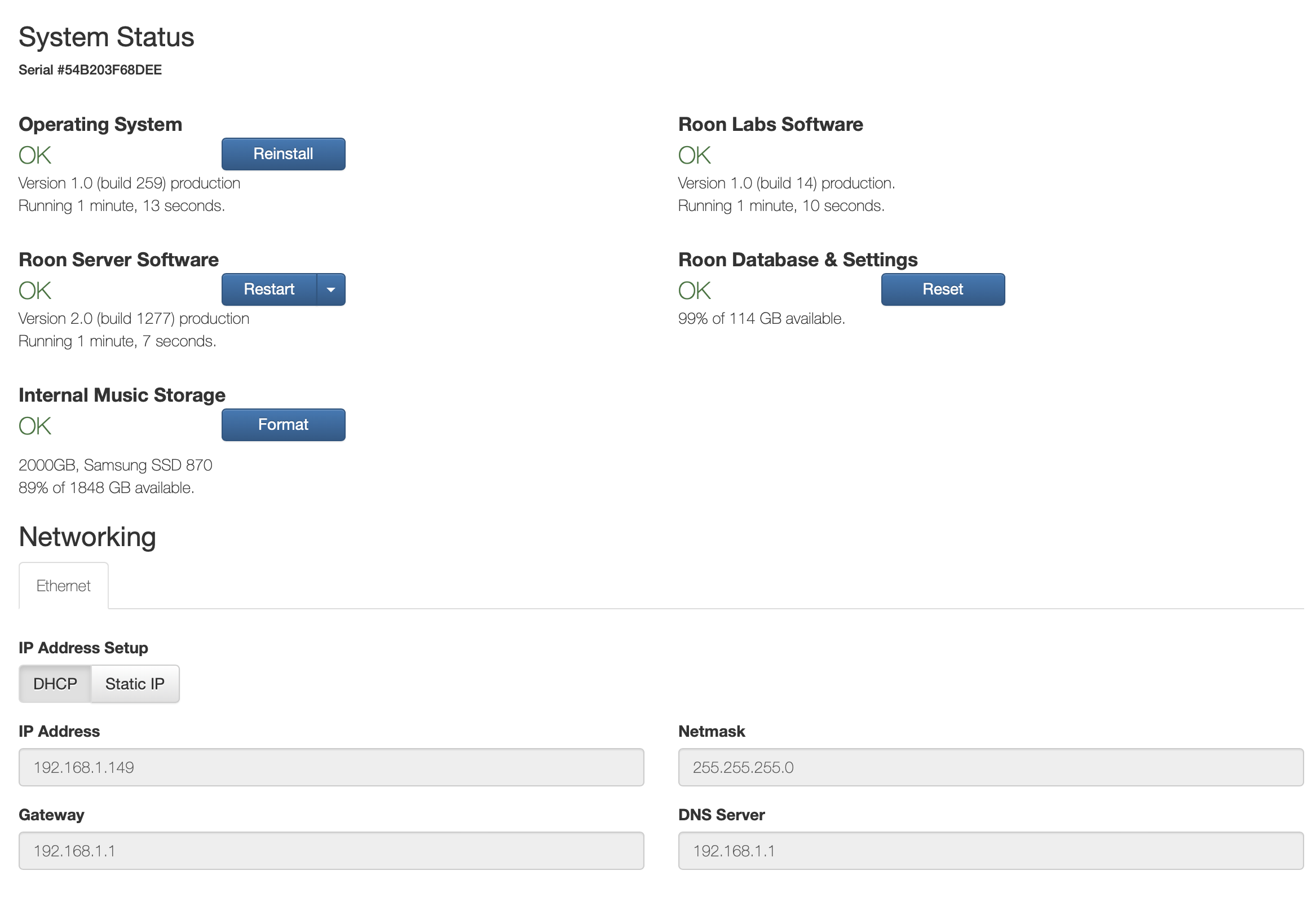 Hi, thank you for the replies. Changed back to DHCP in the Nucleus web interface, and released the DHCP reservation on the Router. I then rebooted the Nucleus (although it still assigned the same address… just not static), and the screen shot of the web interface is as follows: