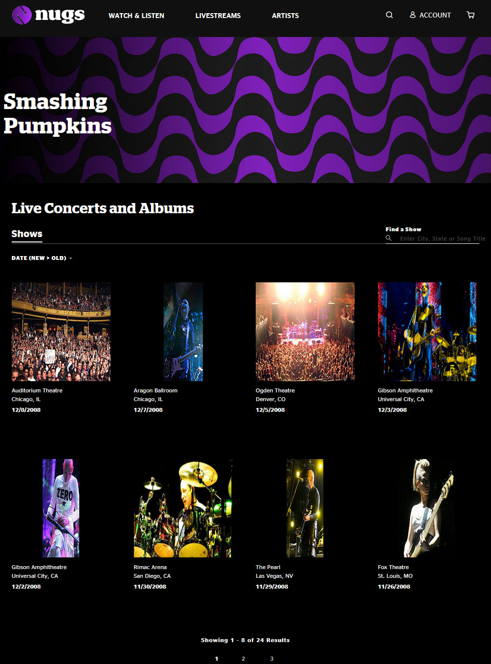 Those Smashing Pumpkins show are only available for purchase and are not available for streaming. Which is why they do not show up in Roon. Nor do they show up in the Nugs streaming app. Only on nuts.net for purchase.