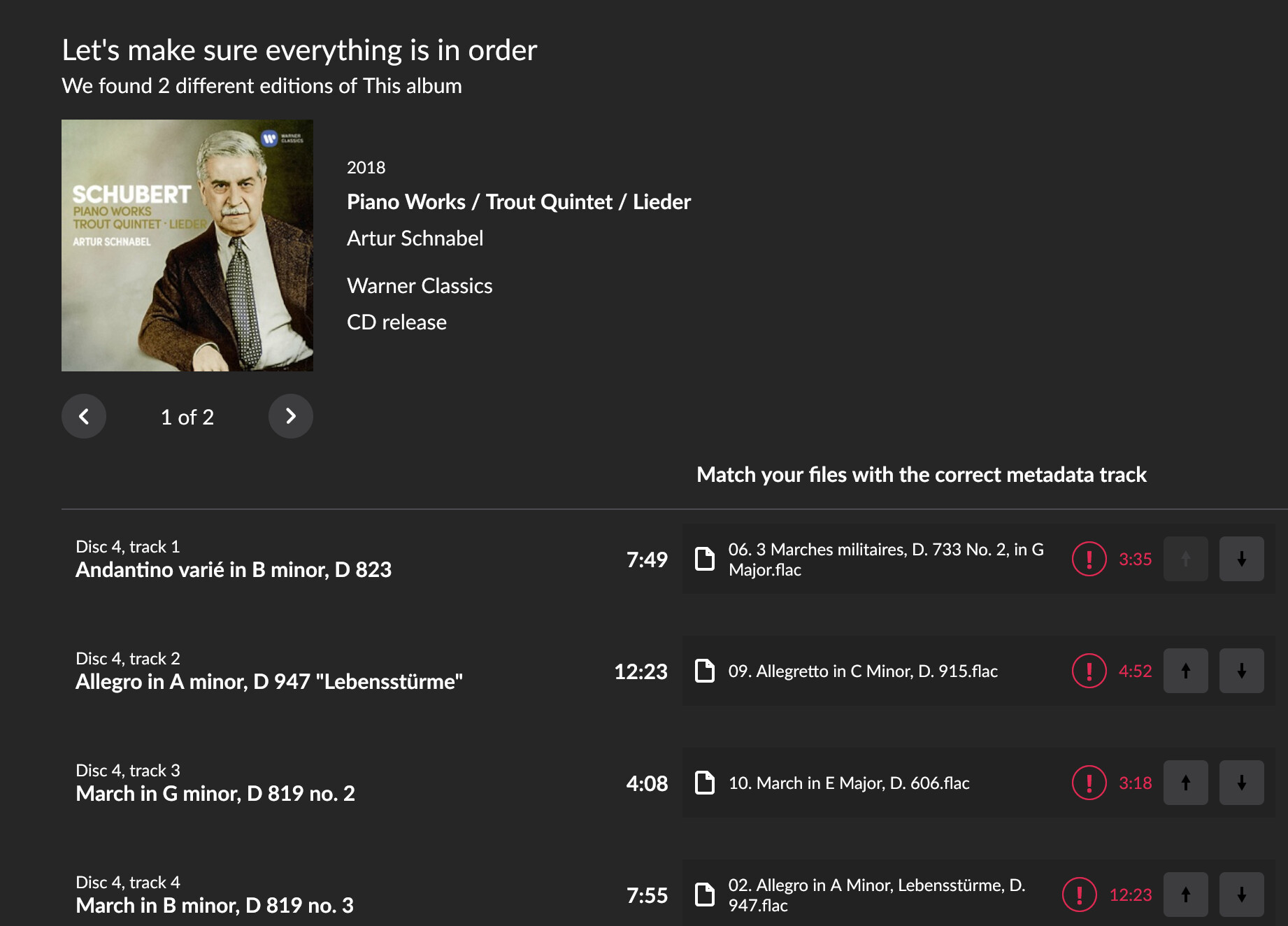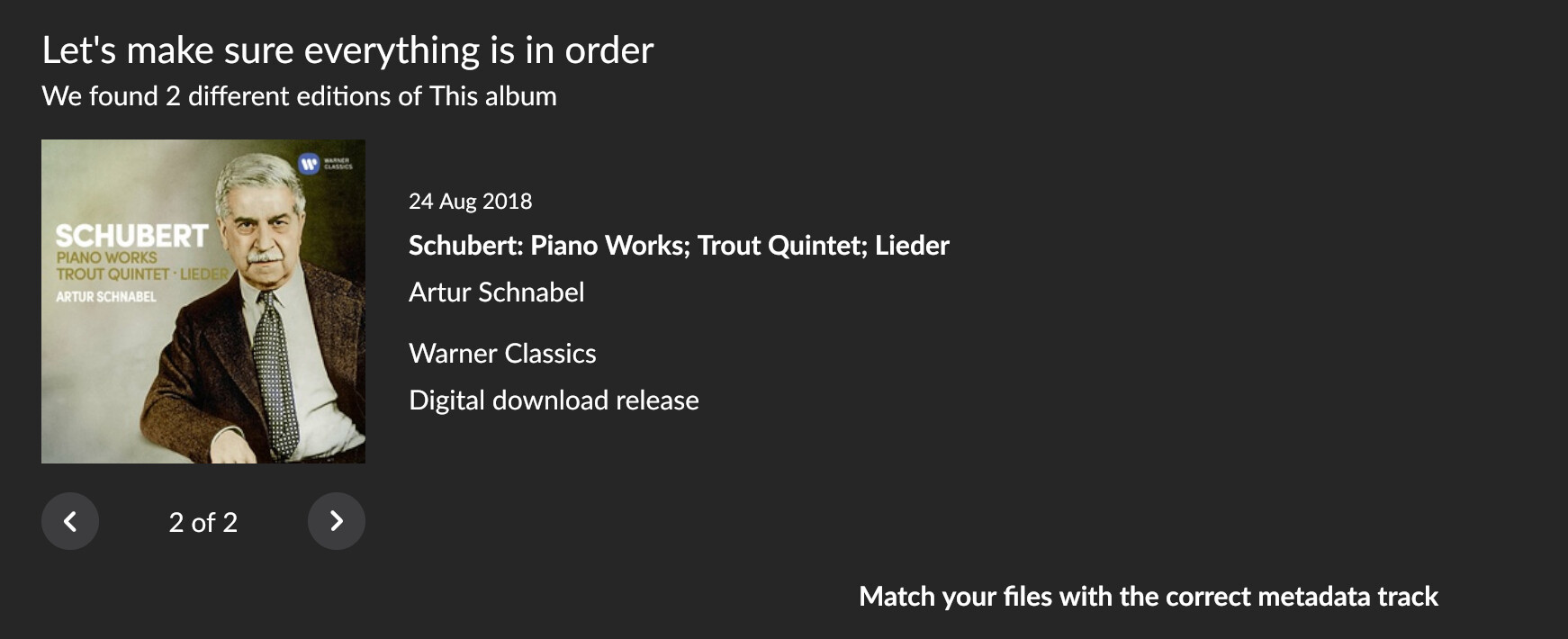 Hi Jason, yes there is. Go to the album details page, select “Edit” from the … menu, then select the “Identify album” (the first item). This brings up the album identification wizard.